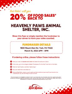 Please stop by Noodles & Company at 2108 South Queen Street in York on January 19th between 4-8pm to support our kitties while eating delicious food! 25% of the proceeds that night goes to Heavenly Paws! Please make sure to either show our flyer on your phone, print it out and bring it along, or simply mention you are there to support Heavenly Paws. The event flyer is located in this event page.