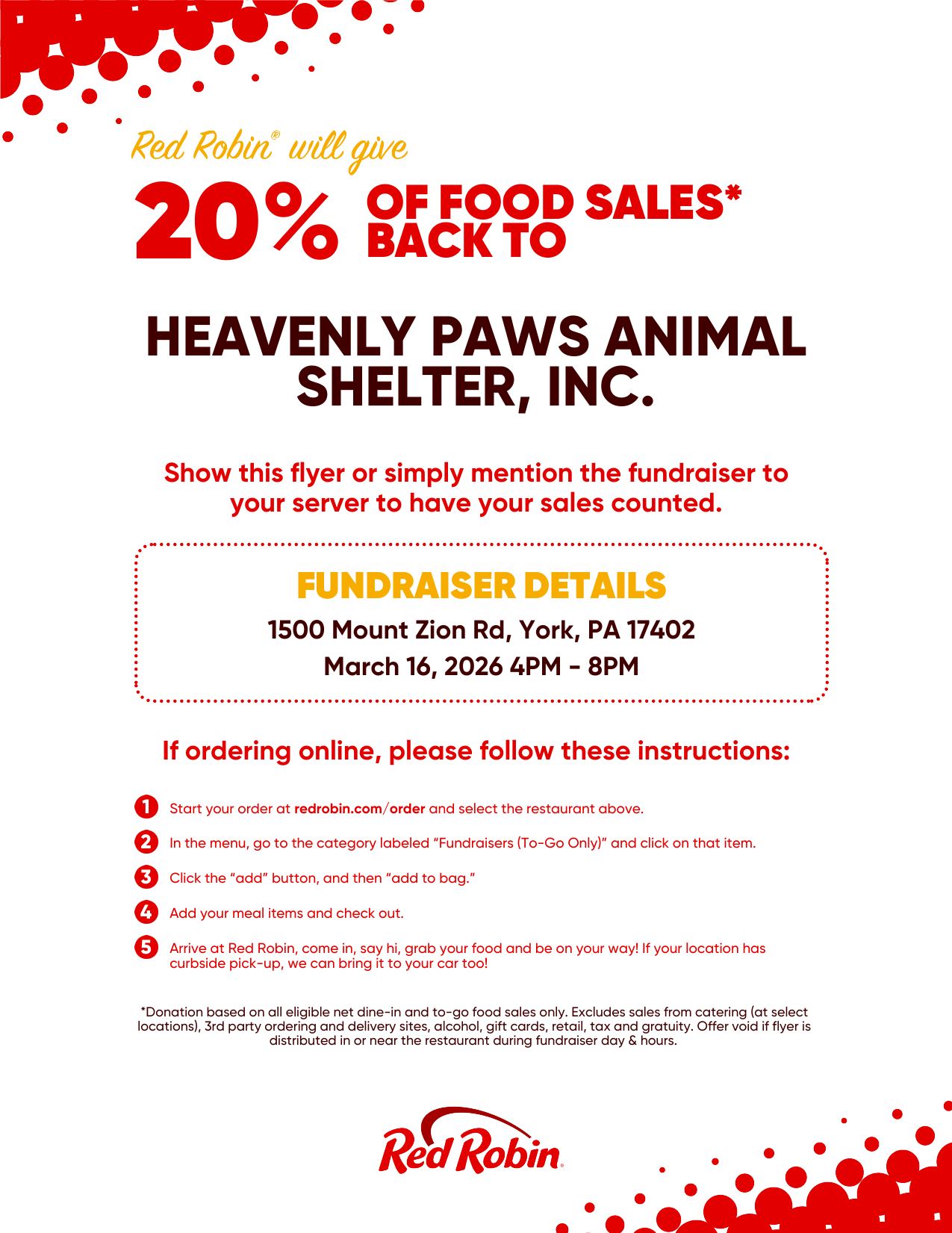 We are having our Red Robin Fundraiser on Monday, March 16th from 4pm to 8pm at the Red Robin in East York