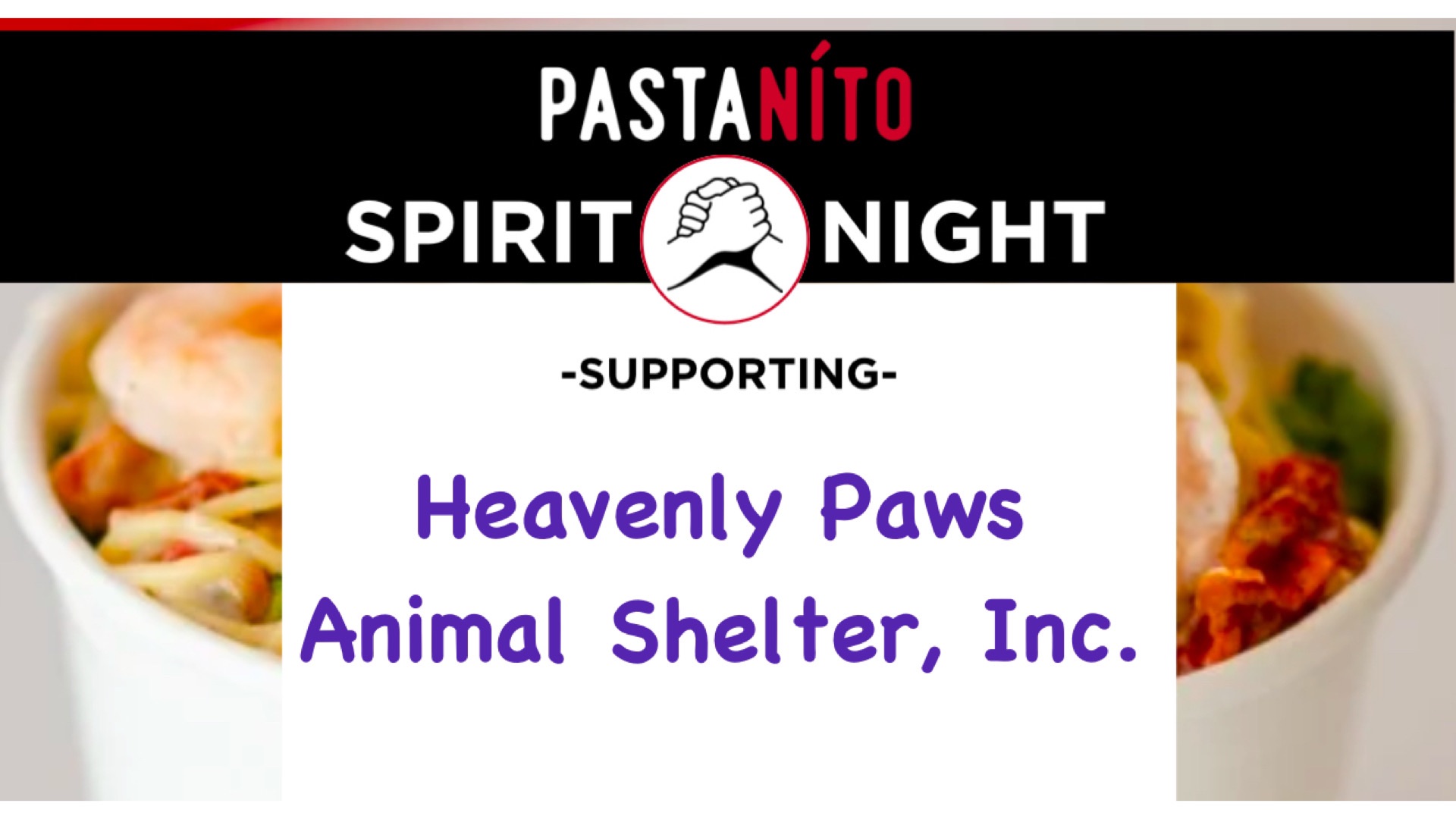We are having a Pastanito (formally known as Presto Fast Italian) fundraiser on Tuesday, October 14th from 6pm to 8p at the South York location (2058 South Queen Street). When you stop in to order your yummy dinner, Heavenly Paws will receive a percentage of proceeds! No need to show a flyer for this fundraiser. Just come to the restaurant to order during our fundraiser time. Food is so good there!! Thank You!