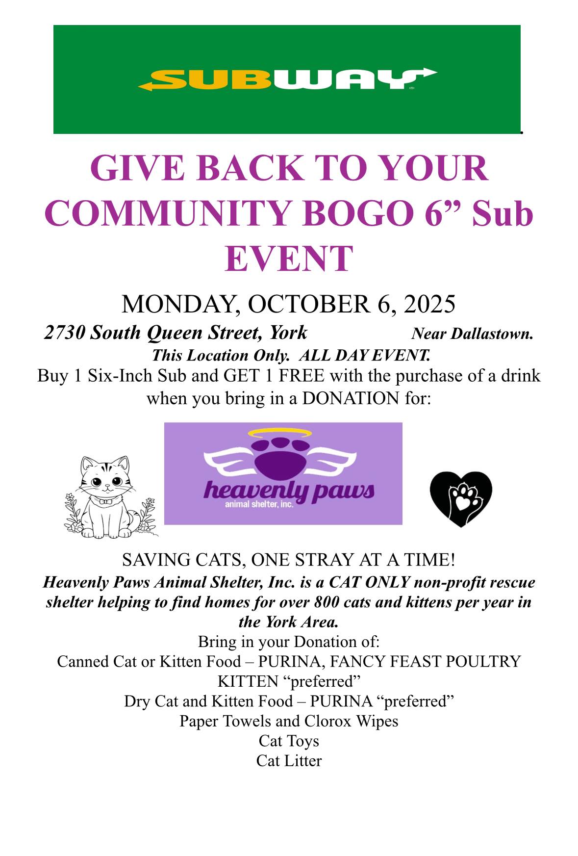 Buy 1 6-inch sub and a drink, Get 1 6-inch sub free if you bring a donation