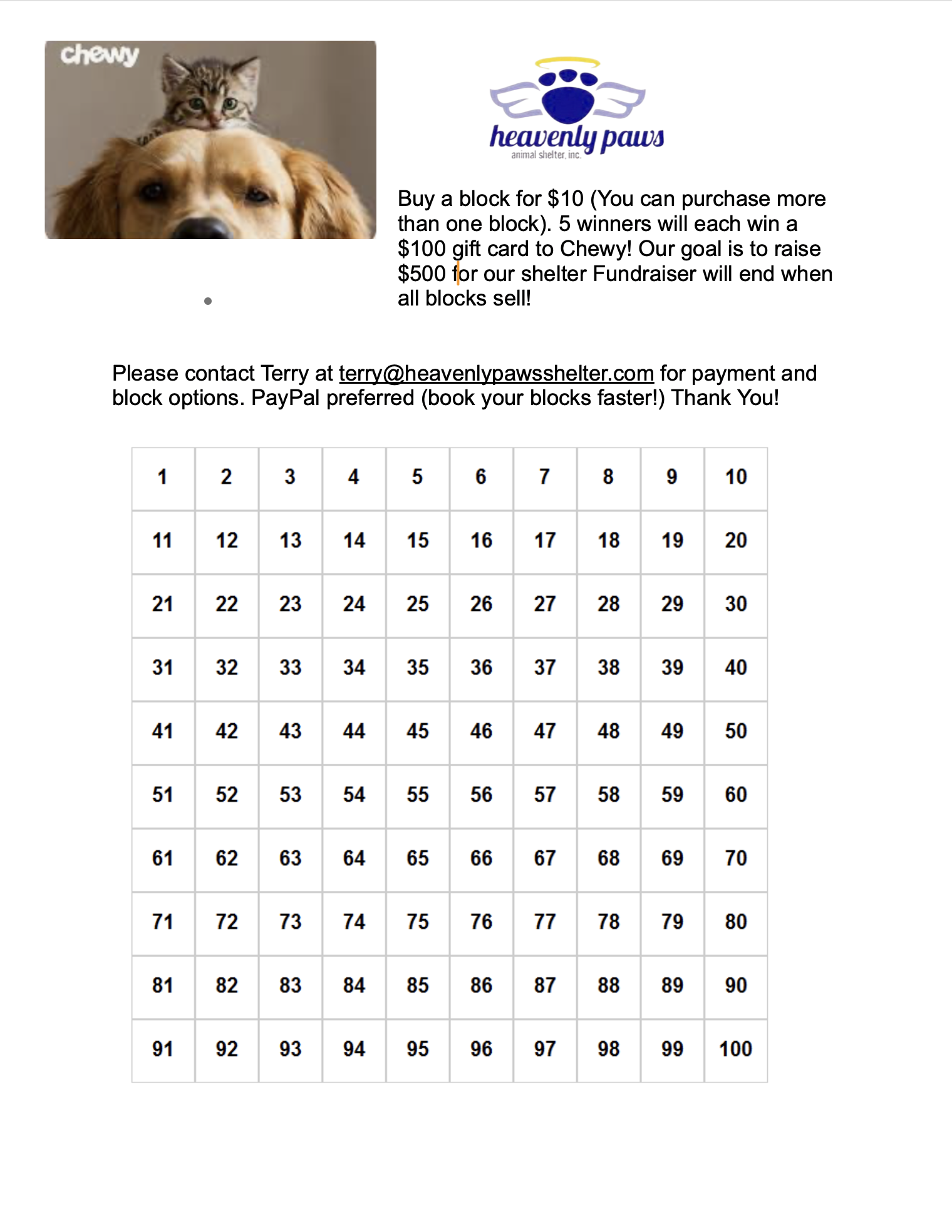 Buy a block for $10 (You can purchase more than one block). 5 winners will each win a $100 gift card to Chewy! Our goal is to raise $500 for our shelter Fundraiser will end when all blocks sell!