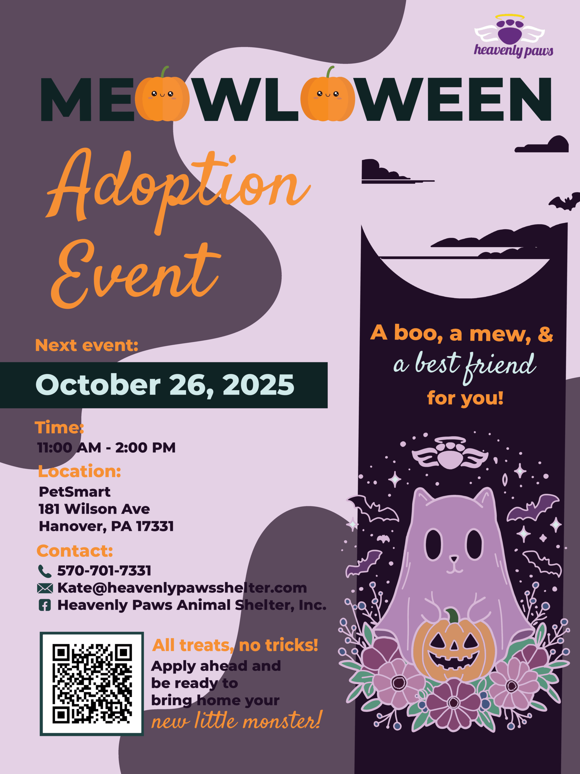 Our Meowloween Adoption Event is on Sunday, October 26th from 11am to 2pm at Petsmart Hanover (181