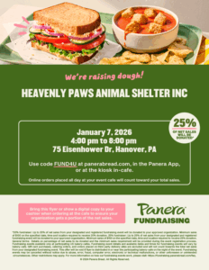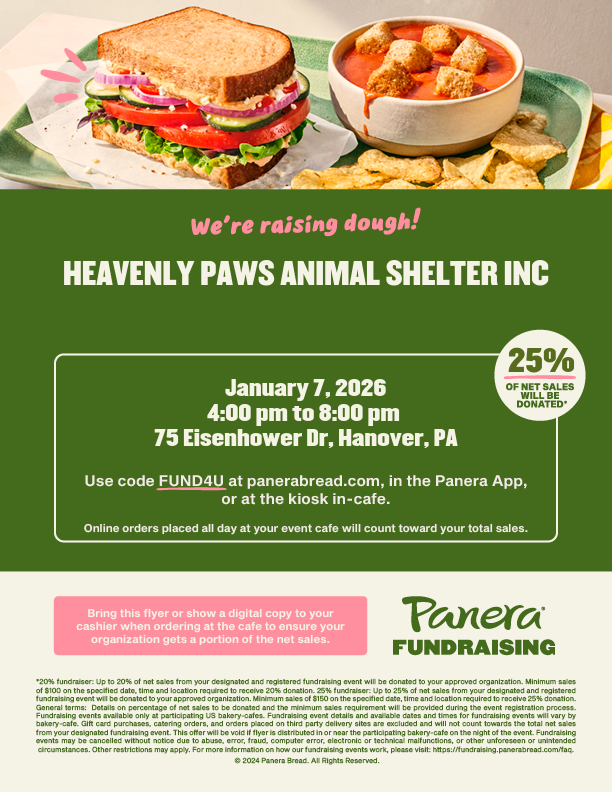Please stop by Panera at 75 Eisenhower Drive in Hanover on Wednesday, January 7th between 4-8pm to support our kitties while eating delicious food! 25% of the proceeds that night goes to Heavenly Paws! Just think – it is a quick dinner on a Wednesday! Please make sure to either show our flyer on your phone or print it out and bring it along.