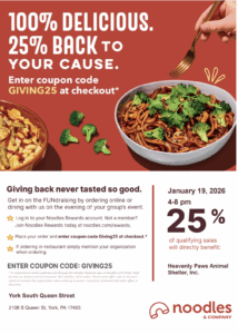 Please stop by Noodles & Company at 2108 South Queen Street in York on January 19th between 4-8pm to support our kitties