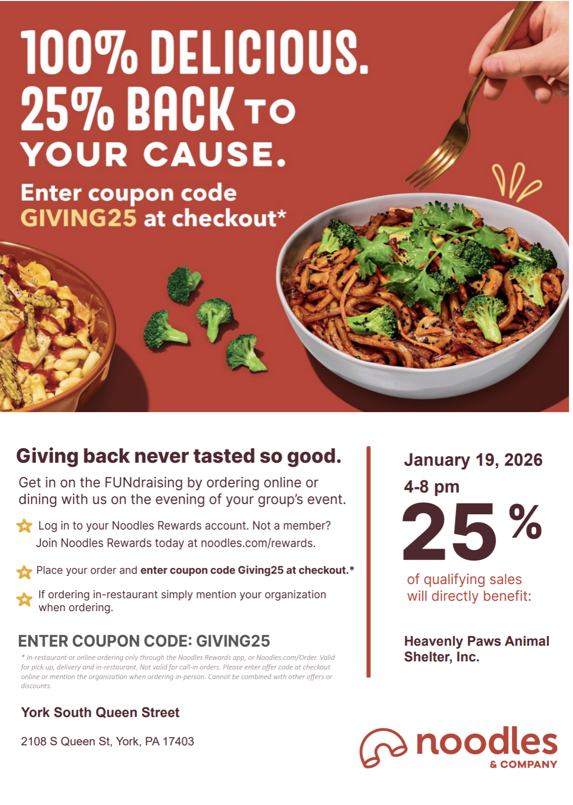 Please stop by Noodles & Company at 2108 South Queen Street in York on January 19th between 4-8pm to support our kitties while eating delicious food! 25% of the proceeds that night goes to Heavenly Paws! Please make sure to either show our flyer on your phone, print it out and bring it along, or simply mention you are there to support Heavenly Paws. The event flyer is located in this event page.
