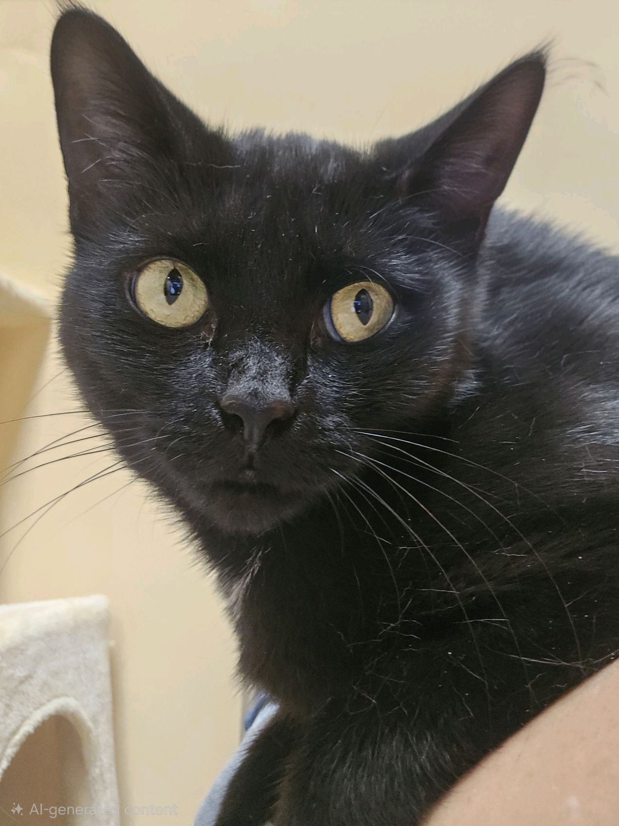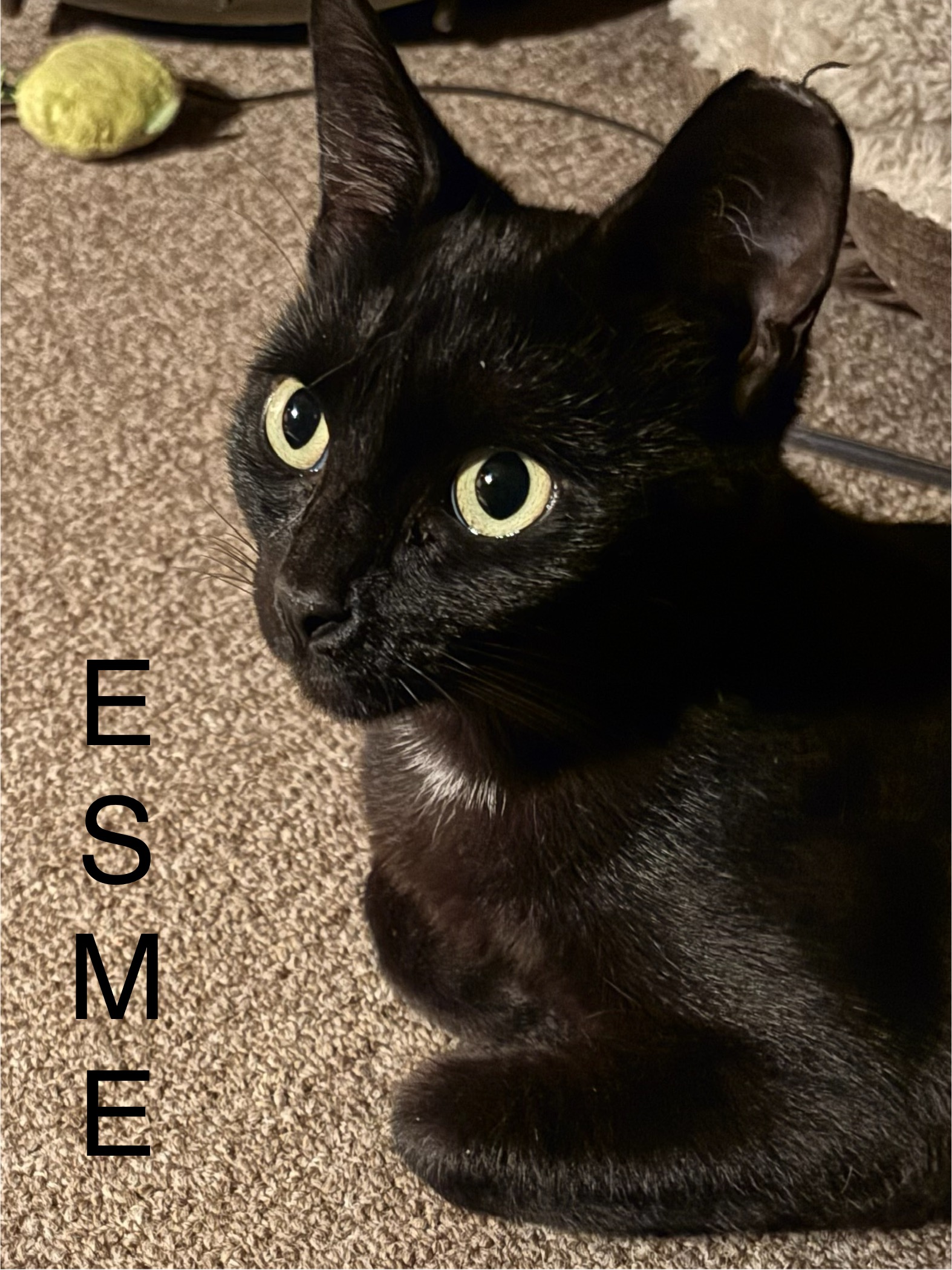 One look into my large golden eyes and you won’t look away. ESME is my name. Come, let me enchant you! I might have survive on dumpster trash at an apartment complex, but that is not who I am. A kind soul found me and showed me and my kittens love. I am forever grateful and abound with affection, purrs and Biscuits. I am a young lady and will mature into and elegant beauty with a heart full of love and faithfulness. I love being with my human. I love to snuggle on your lap or in your arms. I would prefer to be an only kitty so you can shower me with all your affection.I have been spayed, microchipped And Current on all vaccines.,