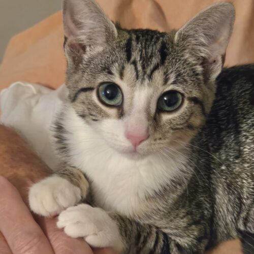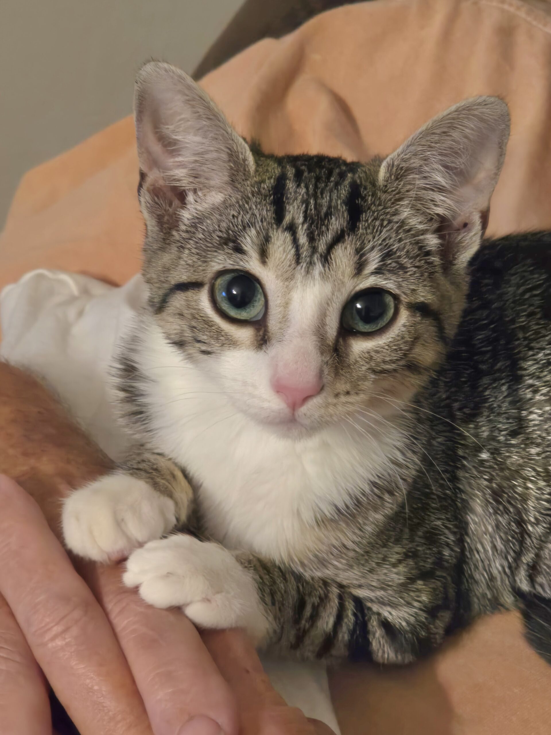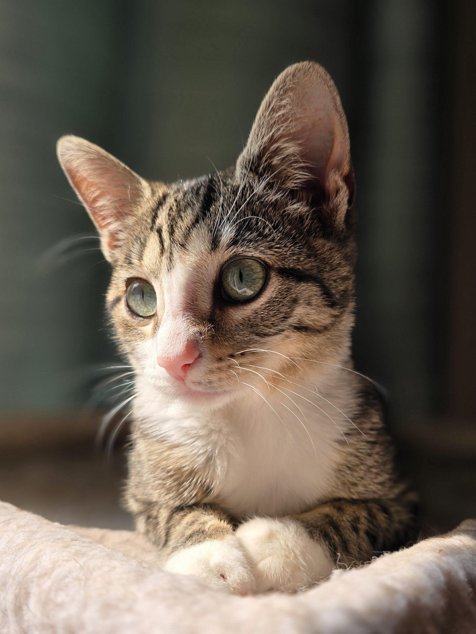 Baguette is a sweet, tiny girl with a lot of love to give. While she can occasionally be a little shy, she loves attention and being around people. Baguette enjoys cuddles and likes to snuggle with her foster dad on the recliner. She has the most beautiful eyes and an adorable pink nose! She shows no fear at being in an new environment and just wants to be part of the family!