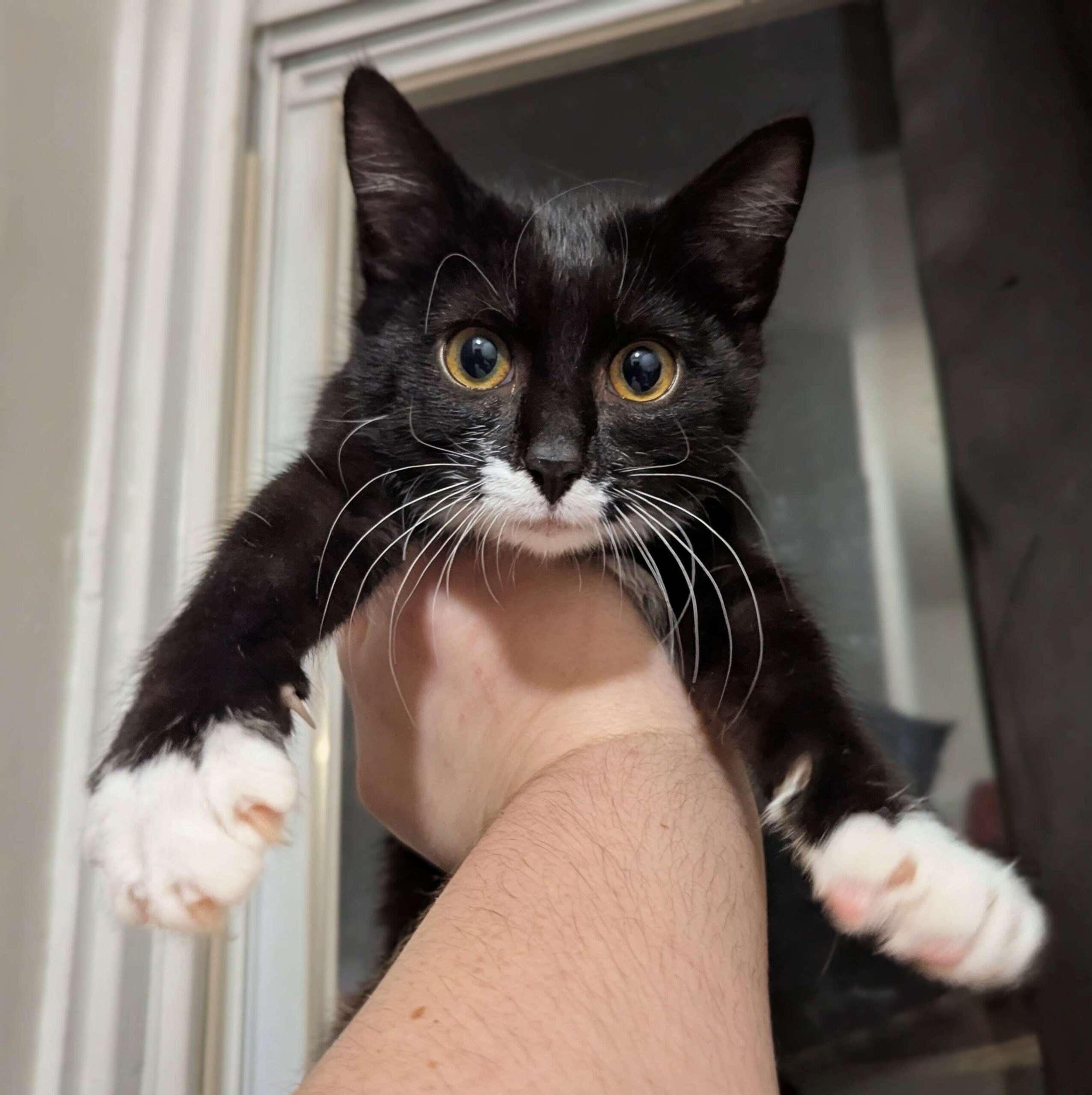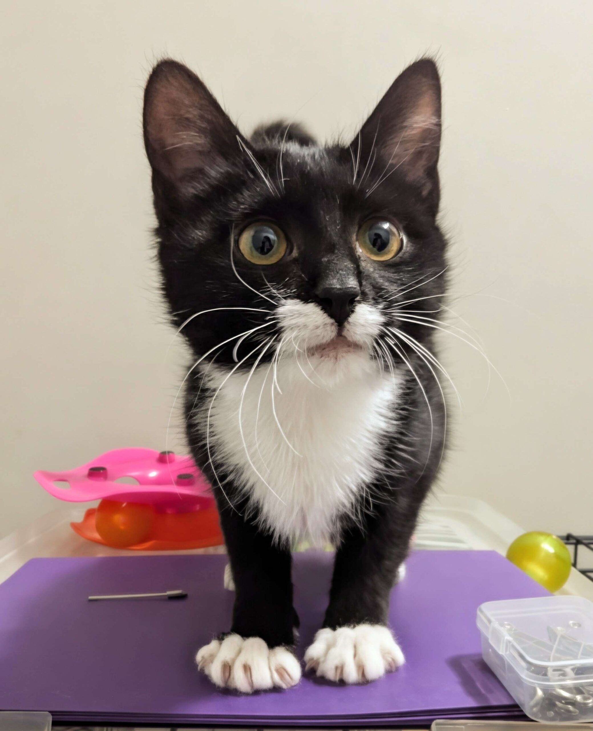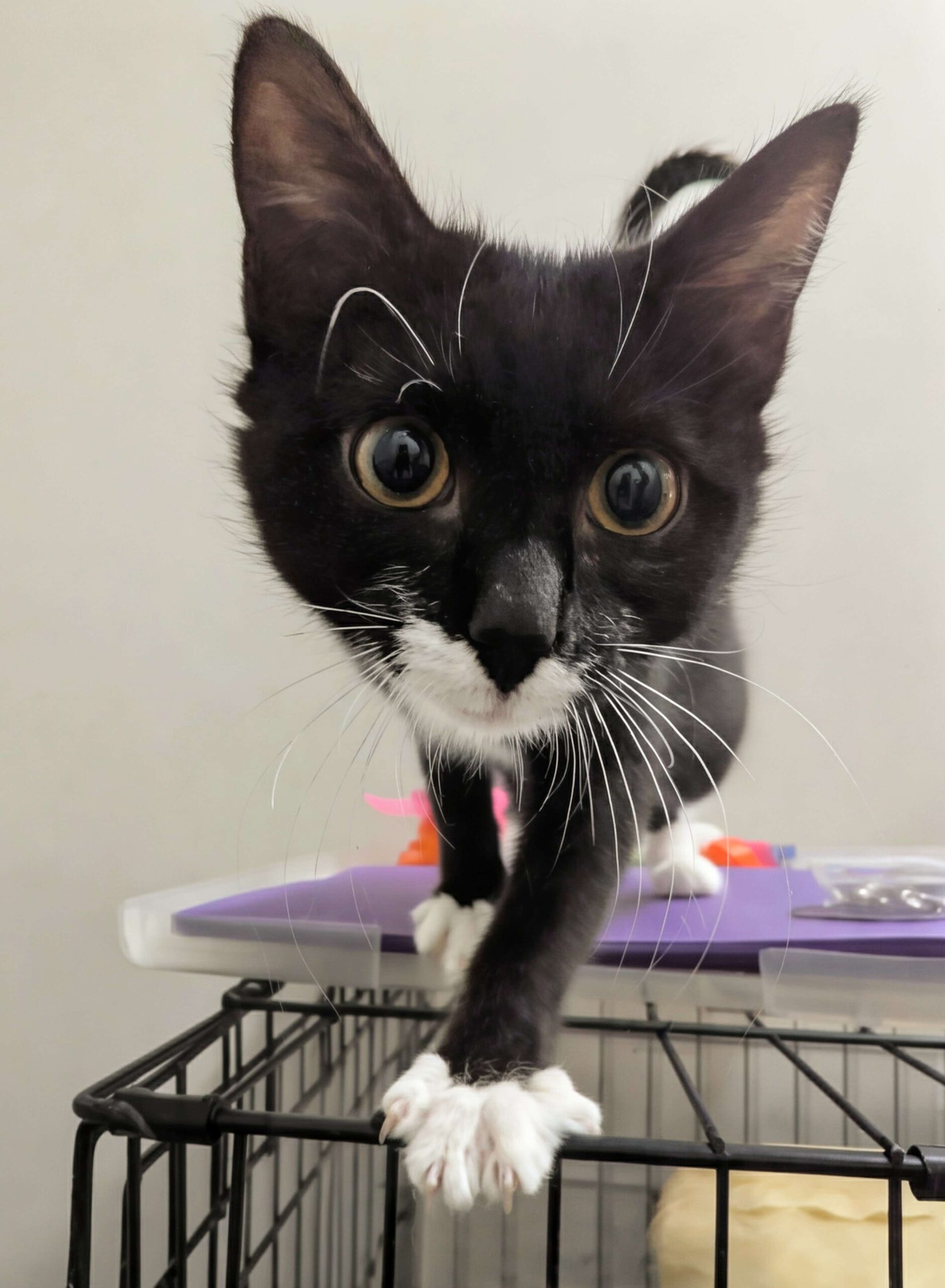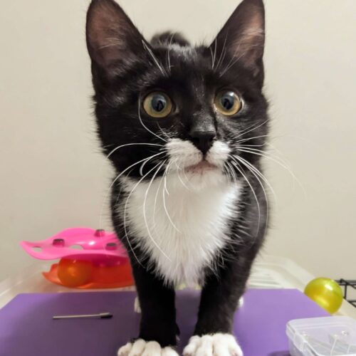 12-wk-old Charm absolutely loves people, and all she wants is to purr all night long, playing and snuggling with her human. She also enjoys playing with other kitties, big and small, and has plenty of energy for running around and chasing toys. A perfect little kitten, she would make a wonderful companion for any home.