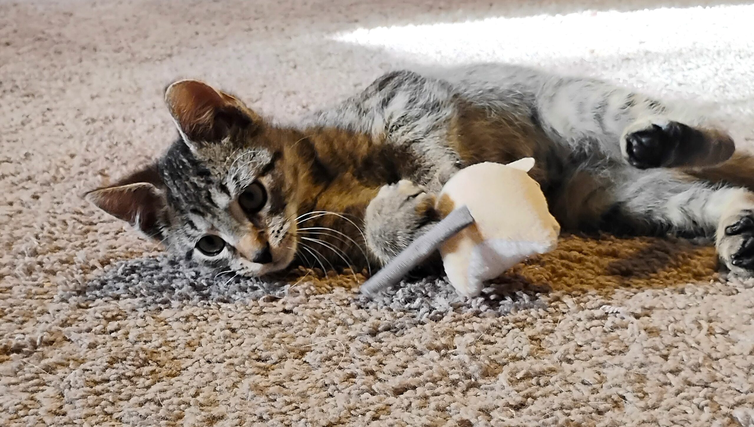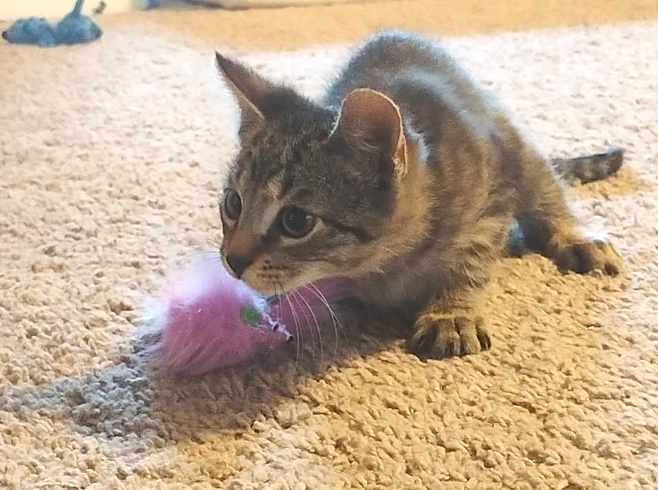 This super cute, playful guy loves toys of all kinds and can turn anything into a game. He spends his days wrestling and adventuring with his brother, chasing after dangly toys, and following the resident house cat George around like a tiny shadow. Christopher is curious, brave, and always ready to explore new corners of his world.