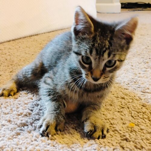 After a busy day of wobbly adventures, he’s happiest curling up in your lap or snuggling against your chest for a well-earned nap. His purrs come easily and often. If you’re searching for a kitten who will brighten every single day, Christopher might be your perfect match!