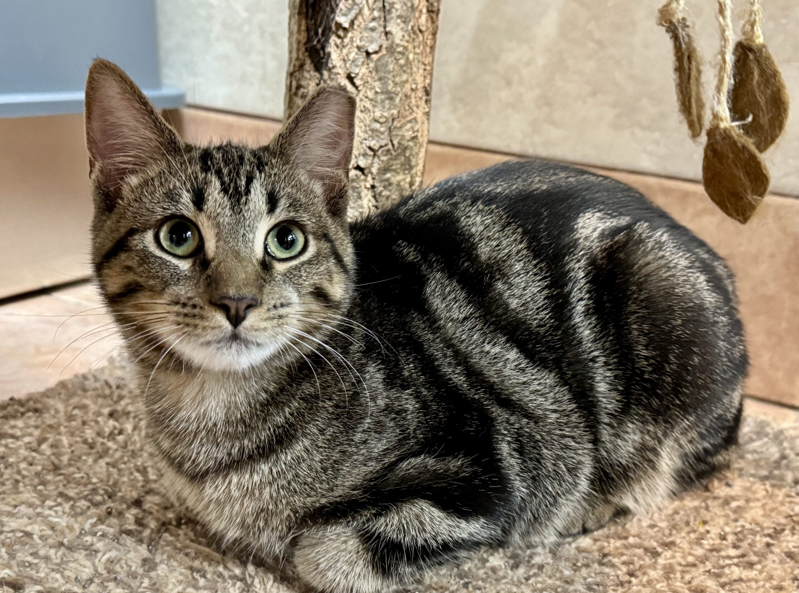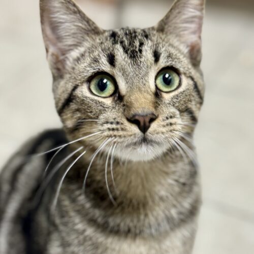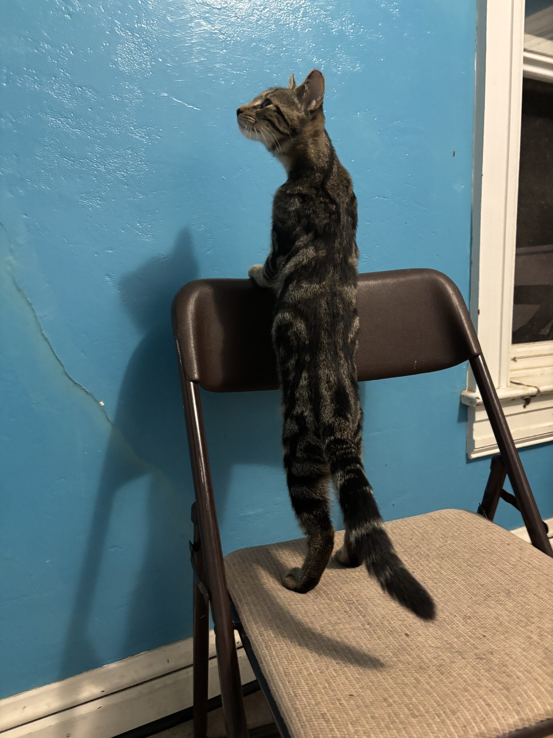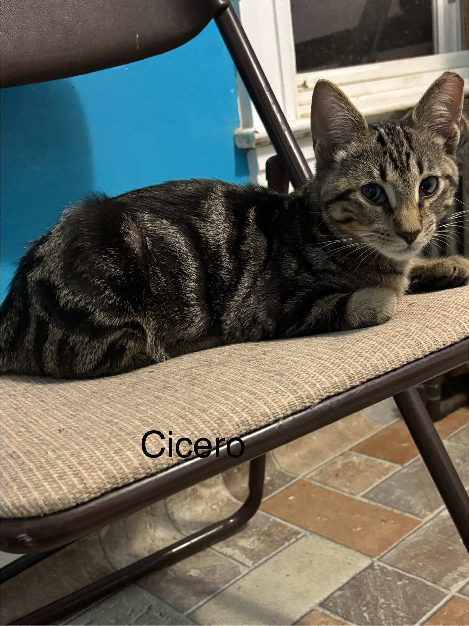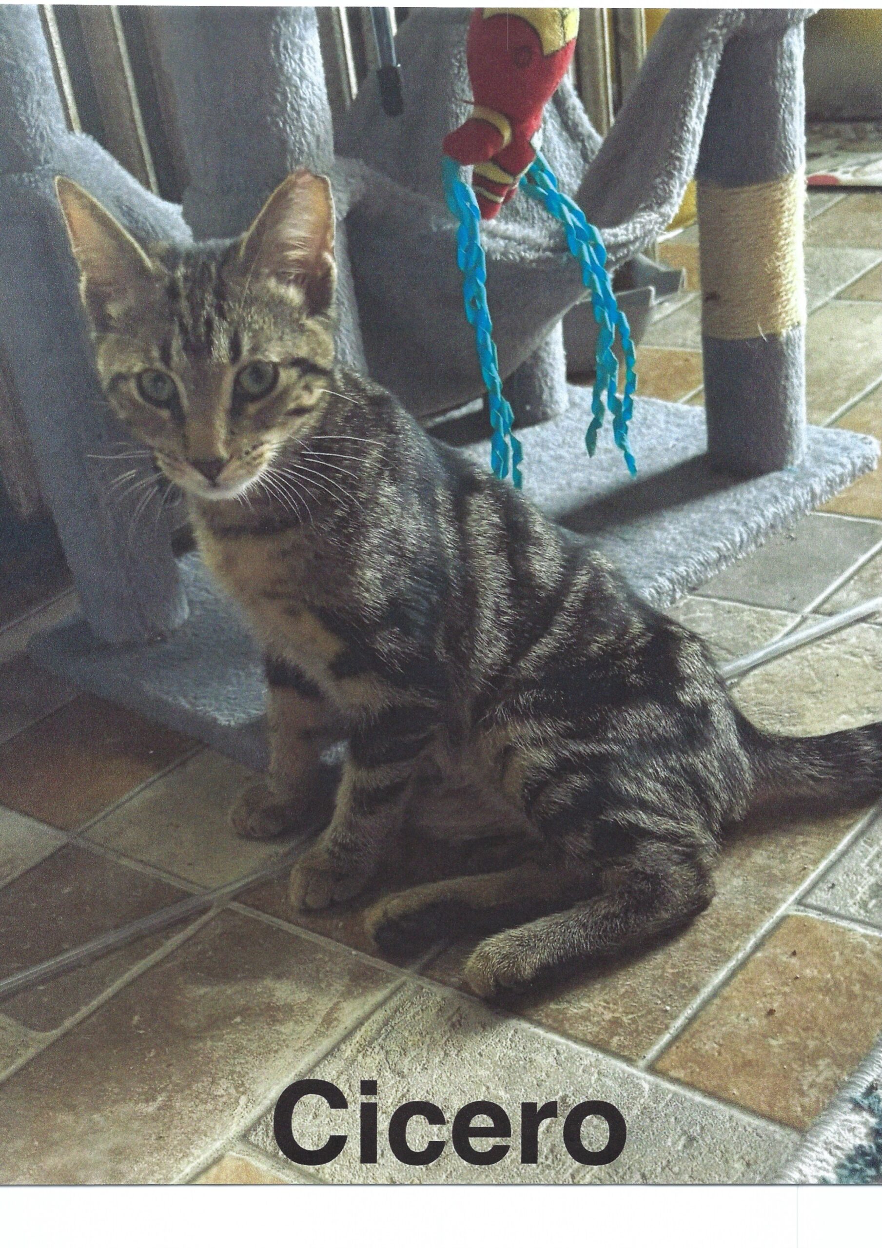 Cicero has come a long way in the 2 months he and his siblings have been in foster care, proving how docile a disposition he truly has. He loves to play with string and wand toys and anything that spins or moves. He is also a snuggler climbing onto your lap for pets in exchange for purrs. he can be picked up, but prefers not to be carried around. With his beautiful swirl coat pattern of varied shades of brown, from chocolate to tan, he is a handsome boy. If you are interested in a lovely pair, check out his sister Tulia, an all black mini panther.