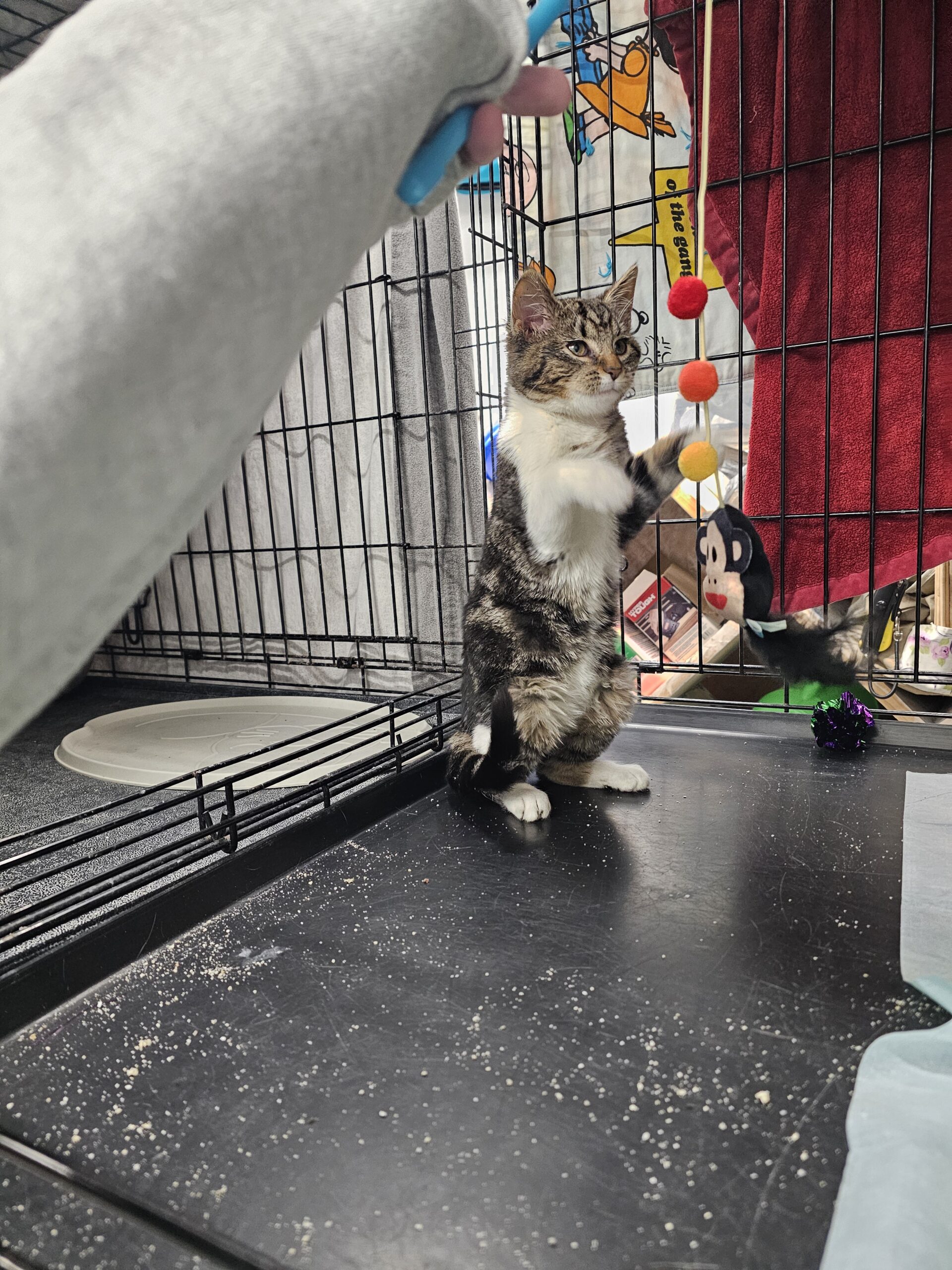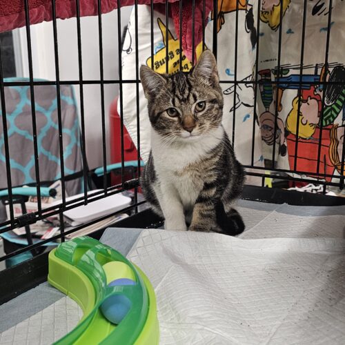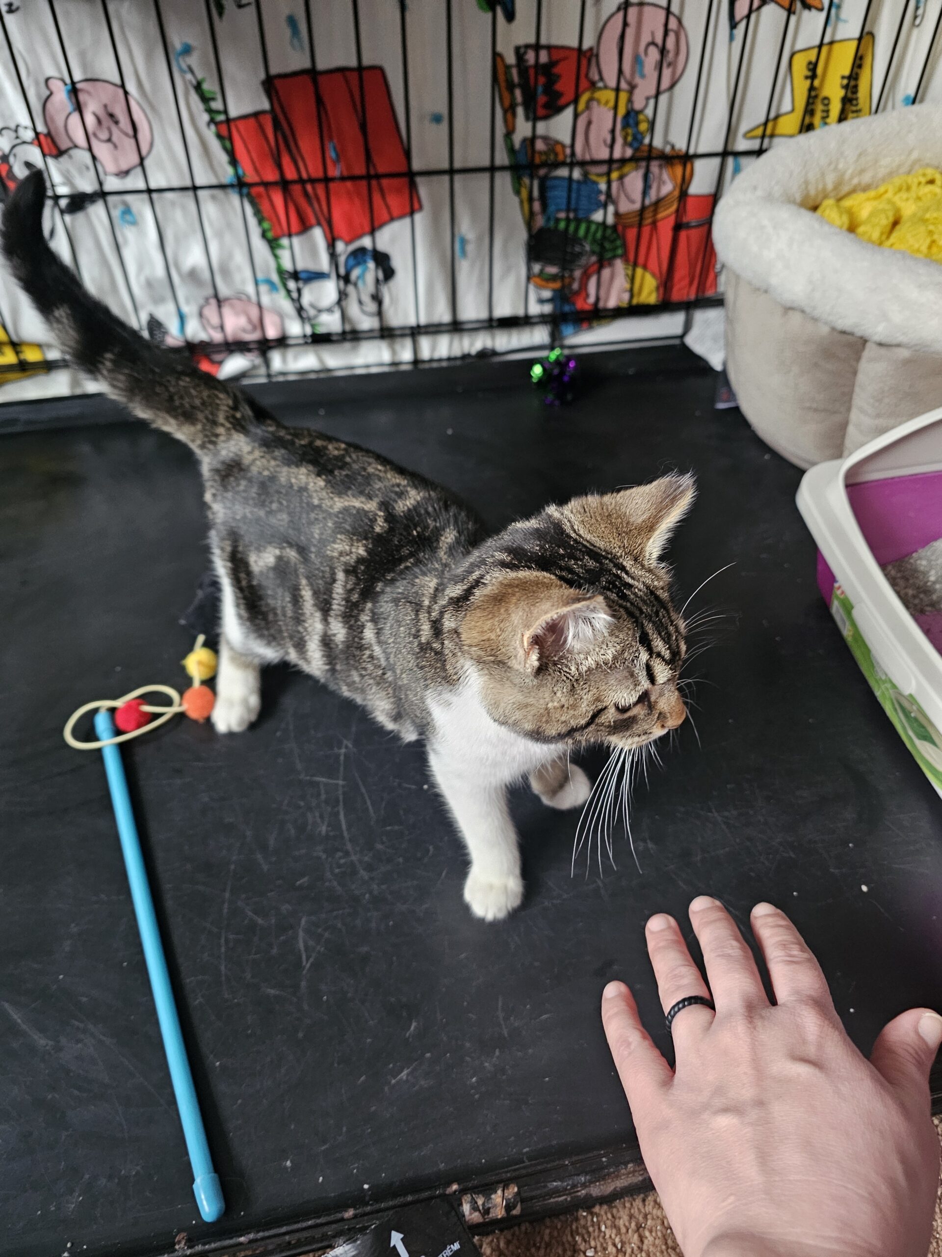 This is Cinnabon. A sweet but shy at first kind of girl. She is quick to roll over and allow belly rubs after getting use to you, and purrs a lot. She loves laying on top of blankets and has her favorite yellow quilt that is a must have for her. She has her first toy that she actually enjoyed playing with (a monkey wand), and she will give it all the bats she possibly can. She is spayed and up to date on vaccines. She is FELV+ but has a clean bill of health otherwise!