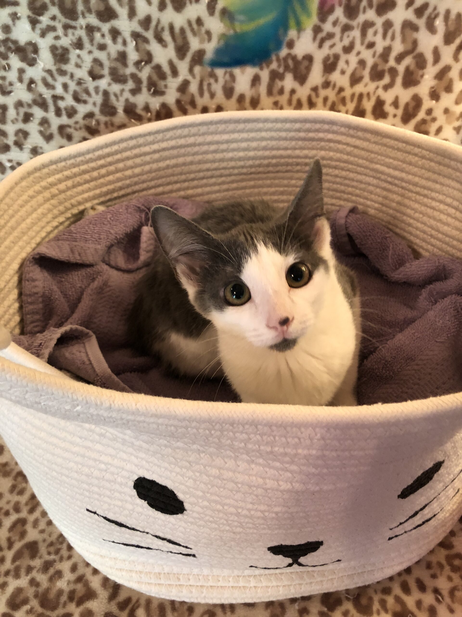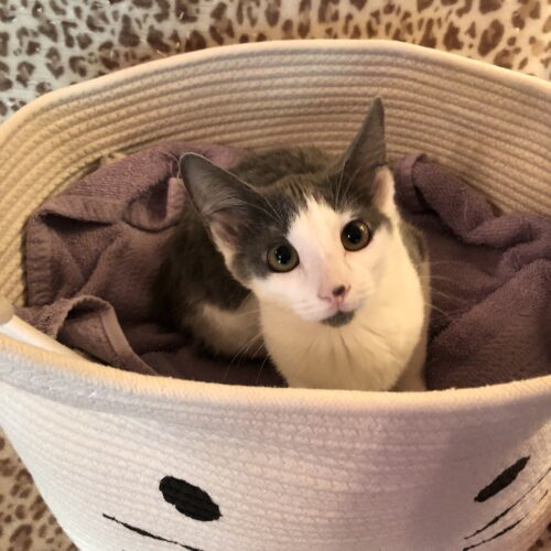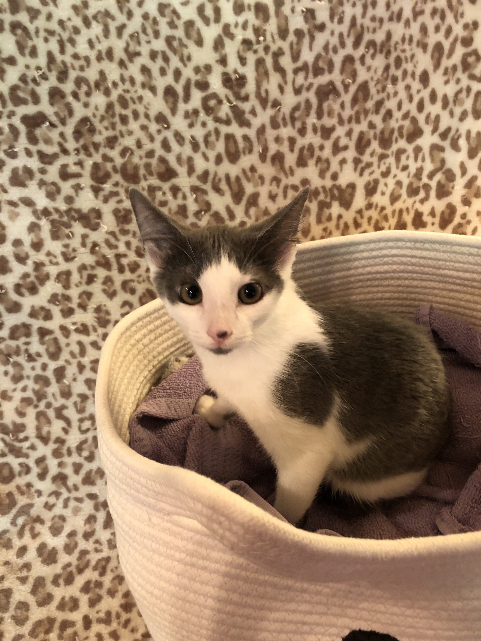 We are a family of 5 gray and white kittens. We are proudly named after singers who have recently passed away: Connie, Francis, Lulu, Roberta and Osbourne. We are all shy so will probably need a quiet home.