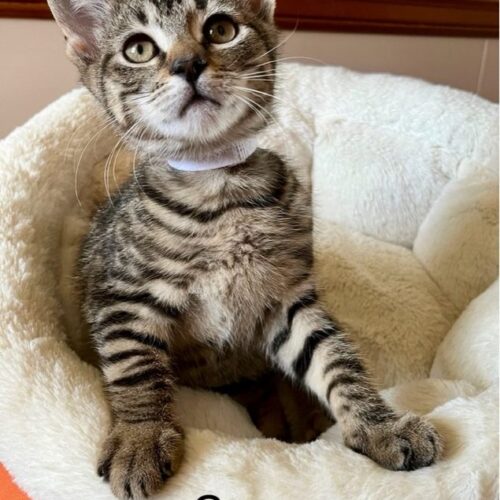 I’m an inquisitive, happy 12 week old that loves to explore and play, especially when my foster mom brings out her magic wand with the feathers on the end. I also enjoy tackling my sisters Apple and Gretchen.  I’m up to date on age appropriate vaccinations and I come with a spay certificate to participating veterinarians.