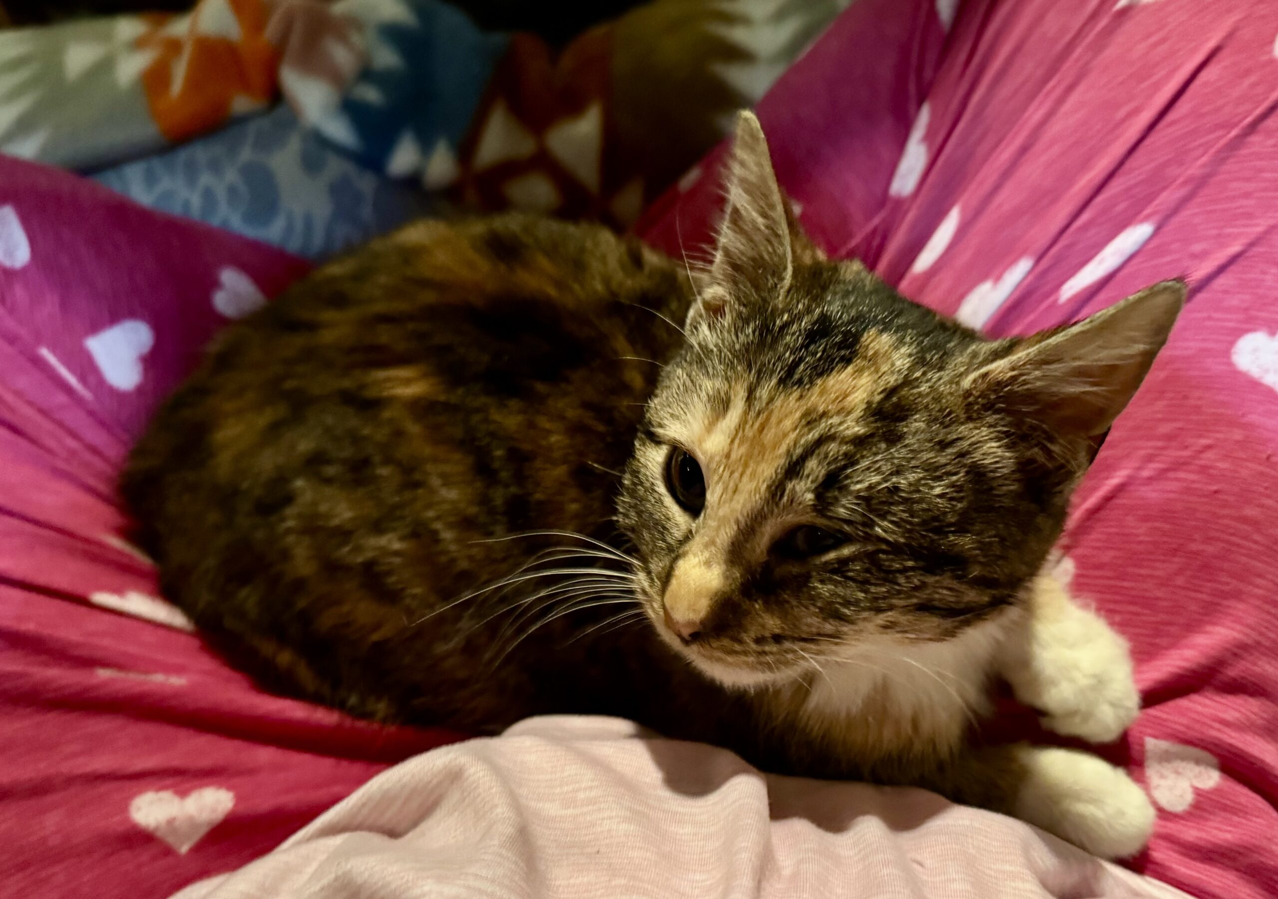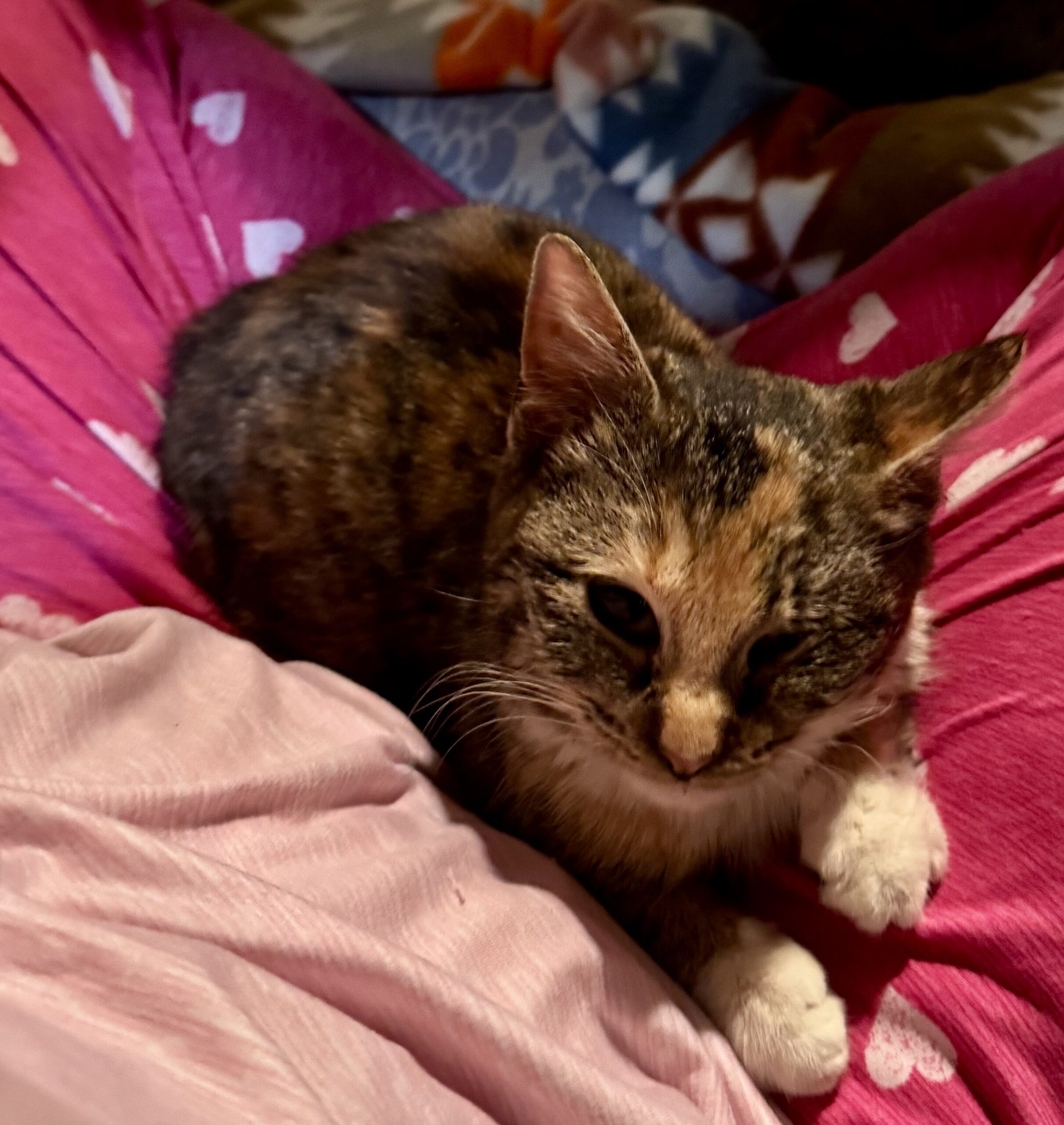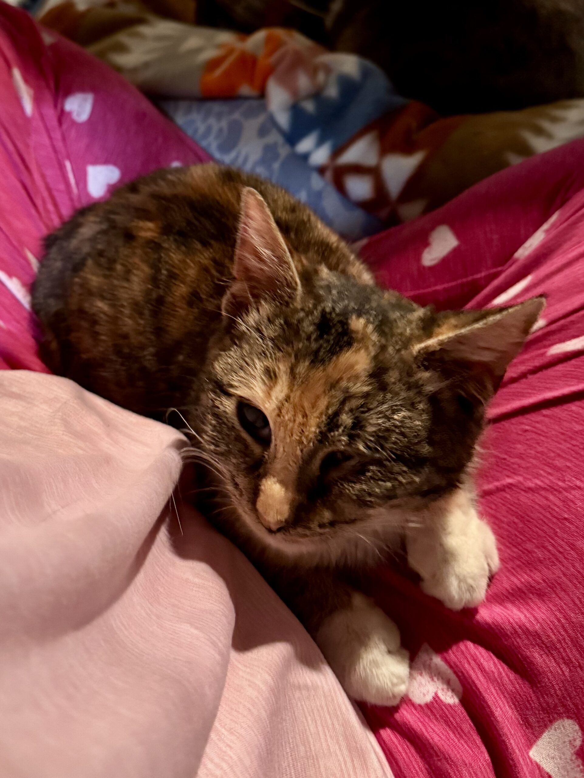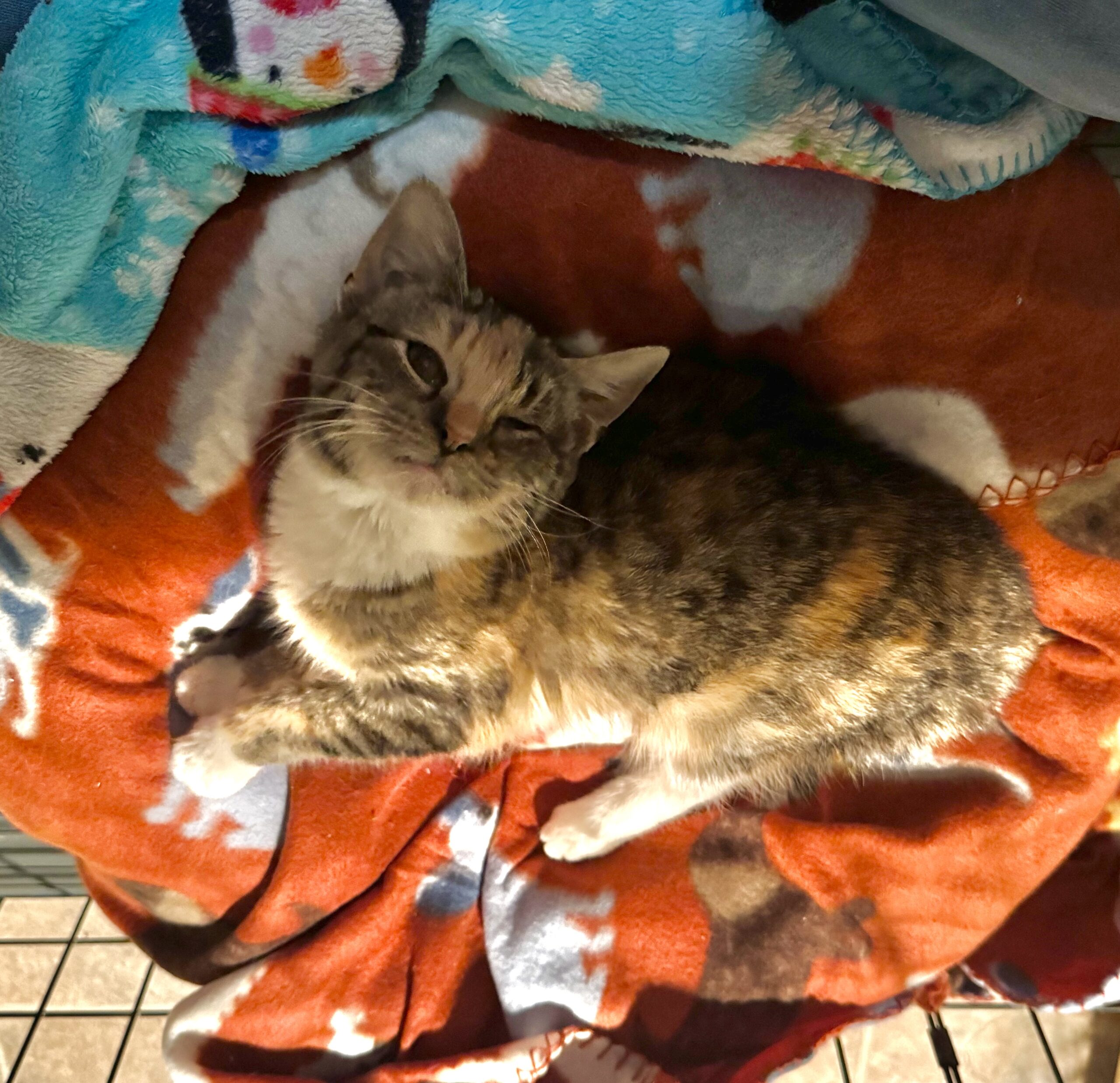 Meet Darla, a sweet and cuddly kitten with a heart full of love. Despite her unique eye, she navigates her world with ease, charming everyone she meets with her gentle and friendly demeanor. Darla loves to snuggle up for a cozy nap or playfully engage in fun games. Her affectionate nature makes her the perfect companion for anyone seeking a loving friend. Adopting Darla means giving her the forever home she deserves, where she can share her limitless love and brighten your days with her joyful spirit.