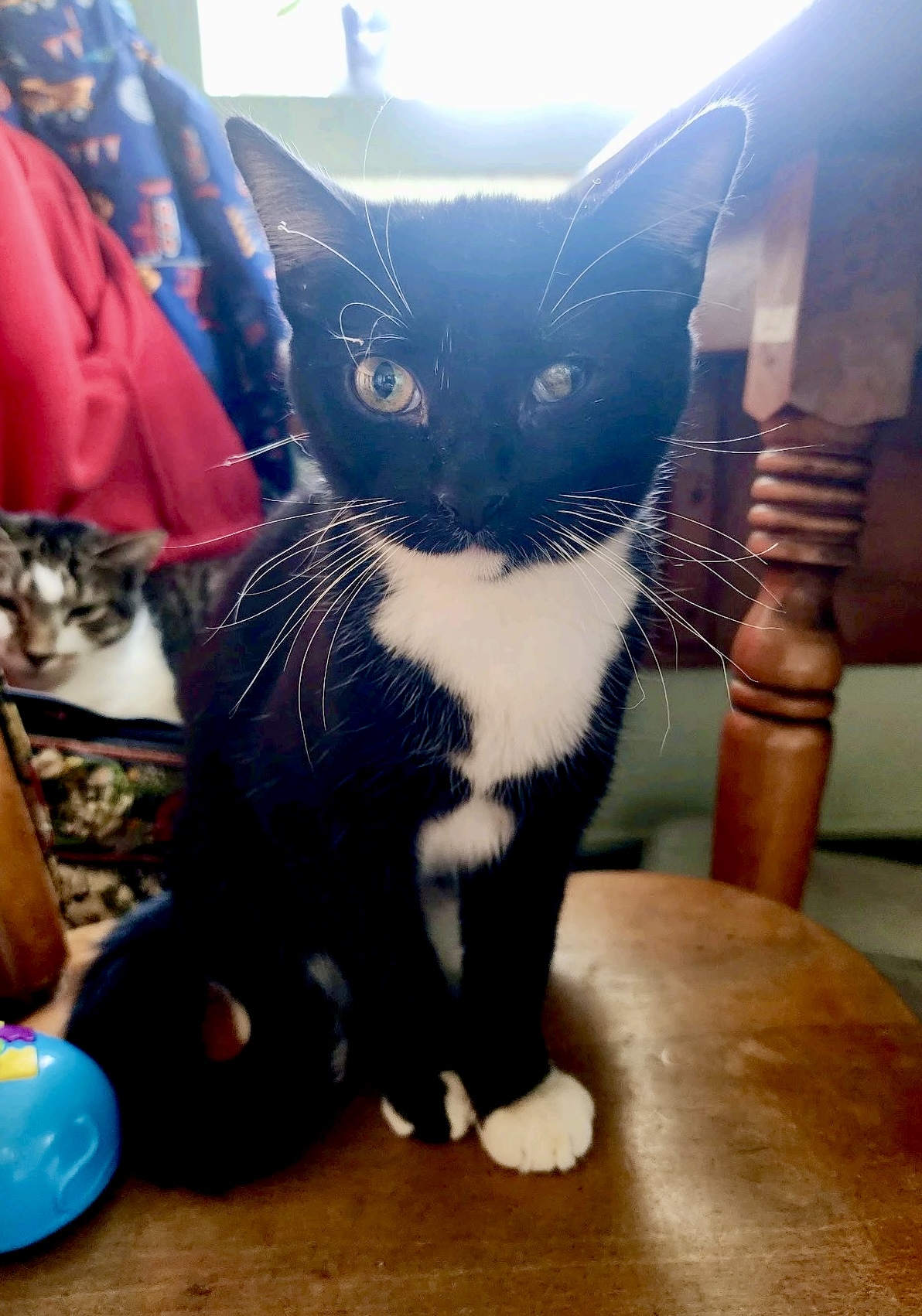Greygrey is super clingy and very sweet. He is a bit skiddish, but does ok with other cats and dogs. He will definitely hide for a week or two in a new home but will adjust. He would do better staying with Lola as they cuddle and play most of the day. He is fixed and has his shots. Hes been dewormed and given flea medicine. He is about 7 months old.
