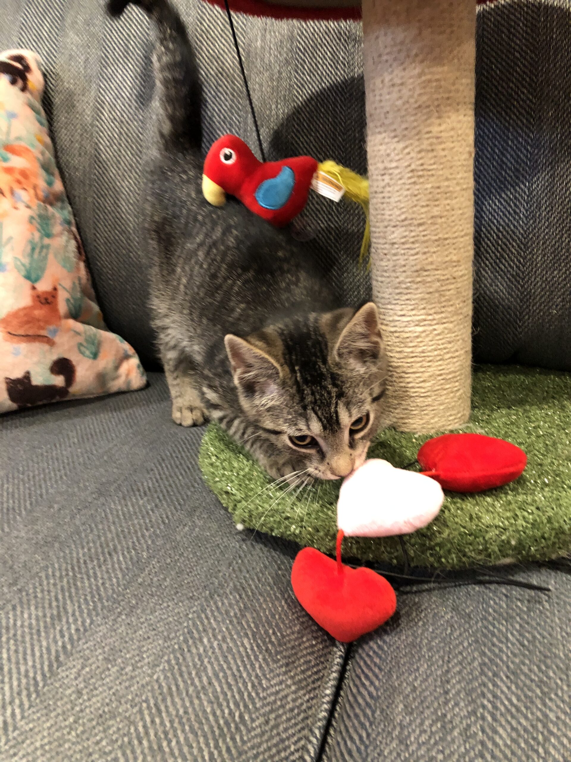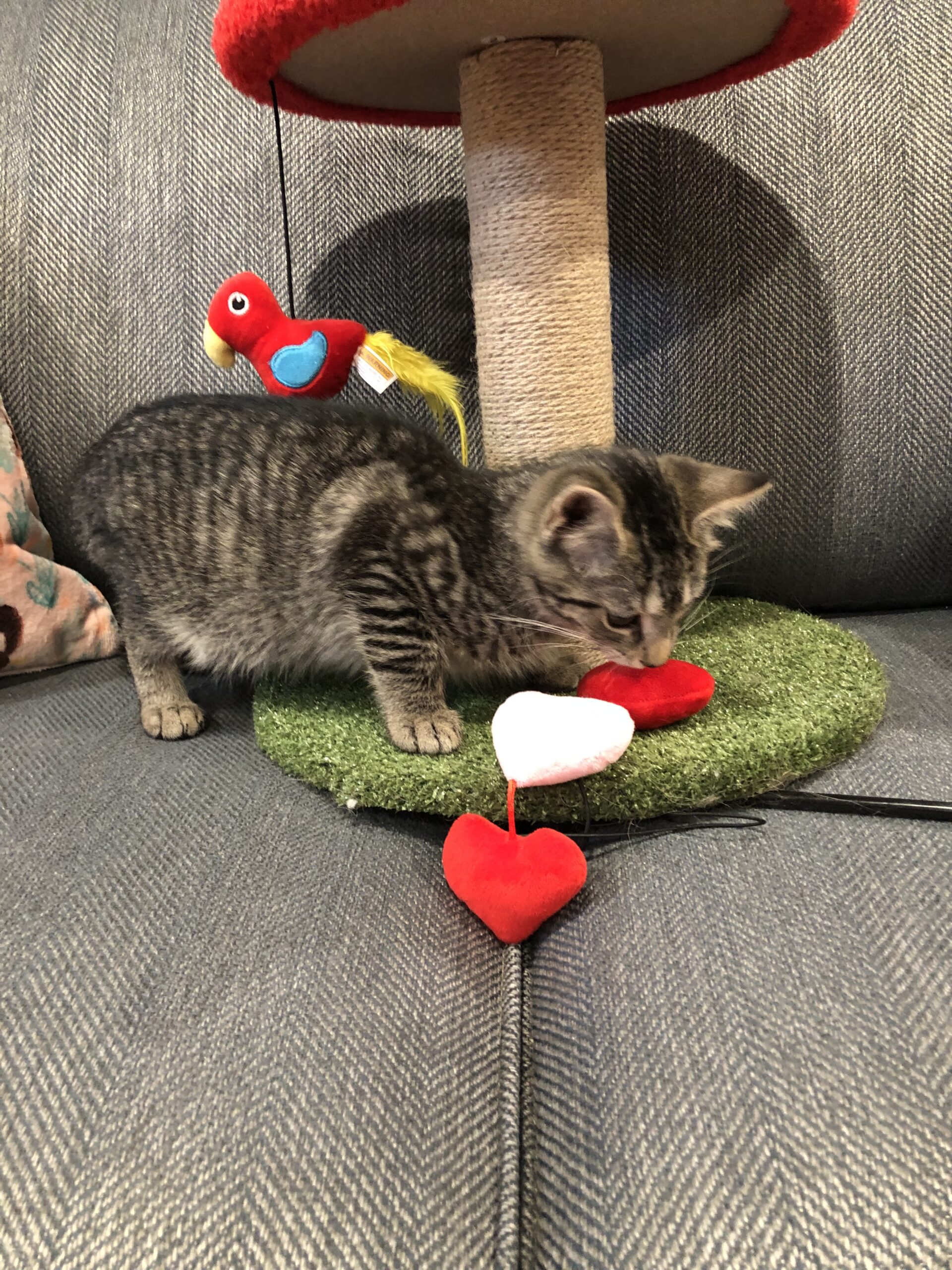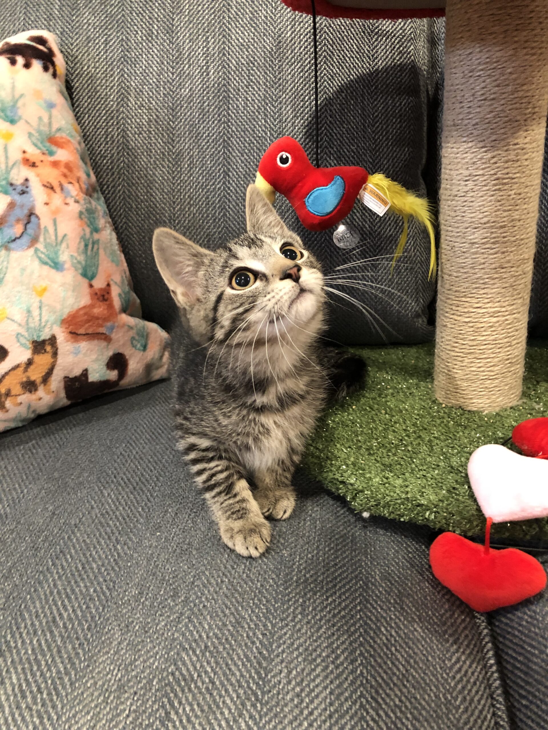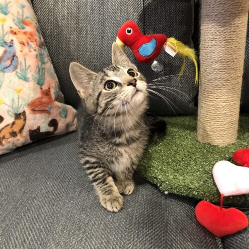 I am a 12 week old playful and handsome boy. I came to my foster’s home with 5 other kittens that I grew up with so am used to playing with others. I love balls, boinks, and cat trees. I am ready to liven up a home!