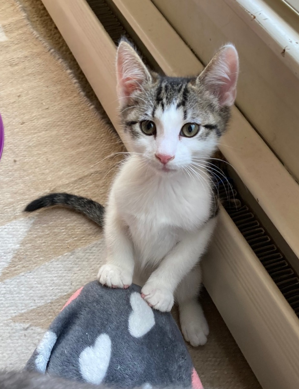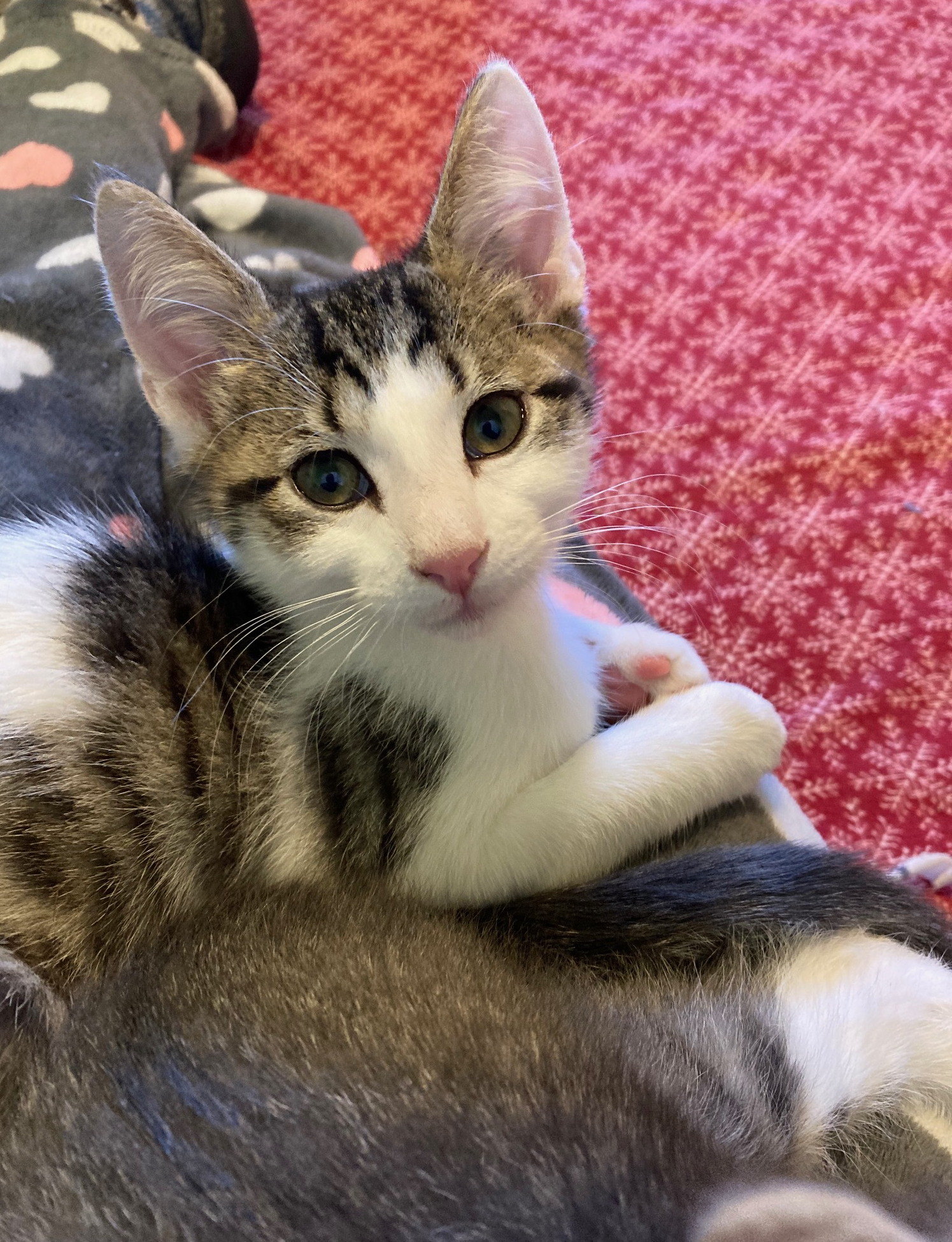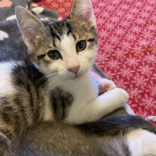 Good natured King is equal parts active kitten energy and angelic kitten cuddliness. This energetic fellow has grown up in a foster home with his 3 siblings (Queenie, Jack, and Ace), numerous cats and a cat-friendly dog and gets along well. He would do best in a home with other fur friends.