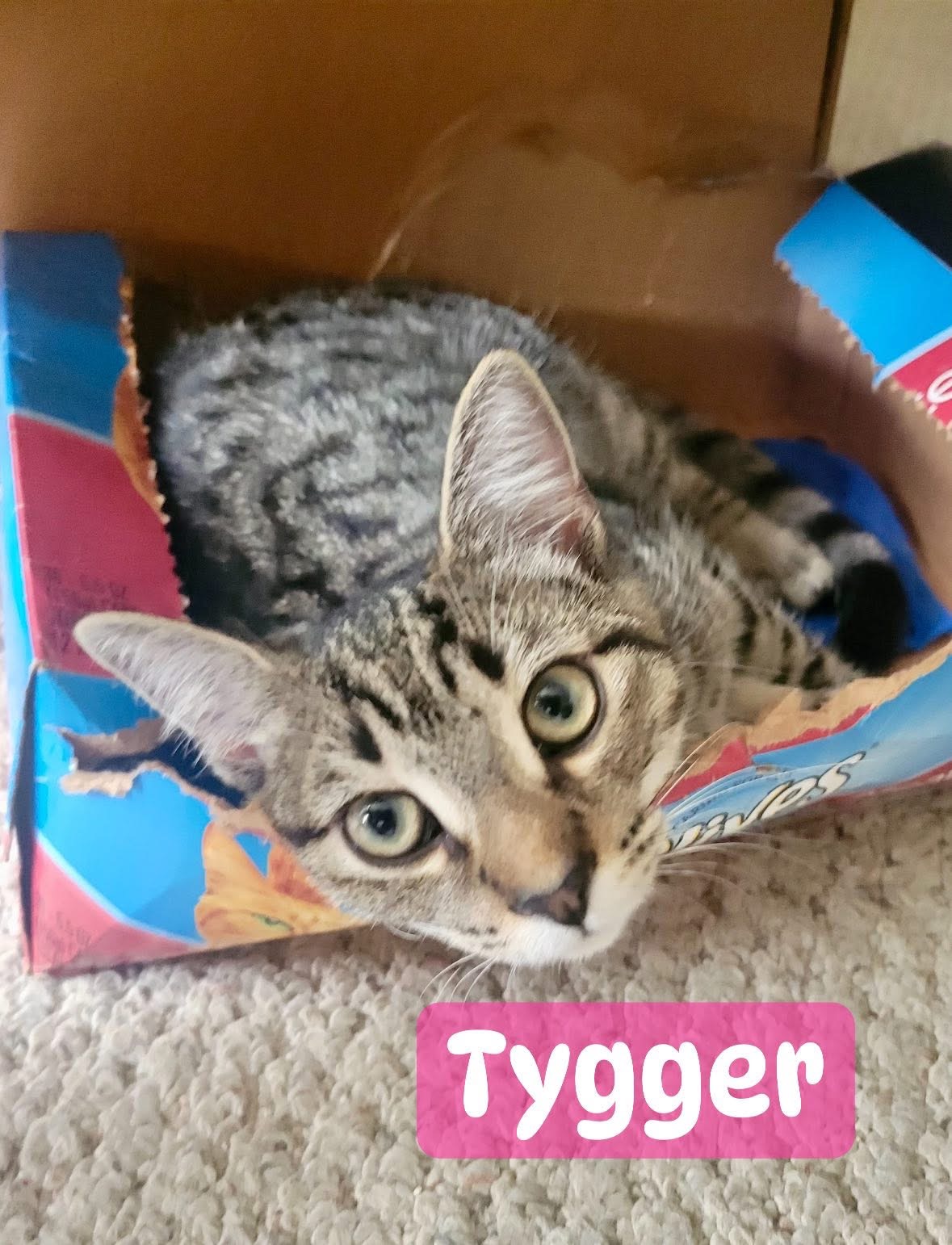 Tygger is Lilly’s daughter. She can be very sweet and is the quickest of the bunch - loves to play with the laser pointer and feather wand. Has not been around children nor dogs.