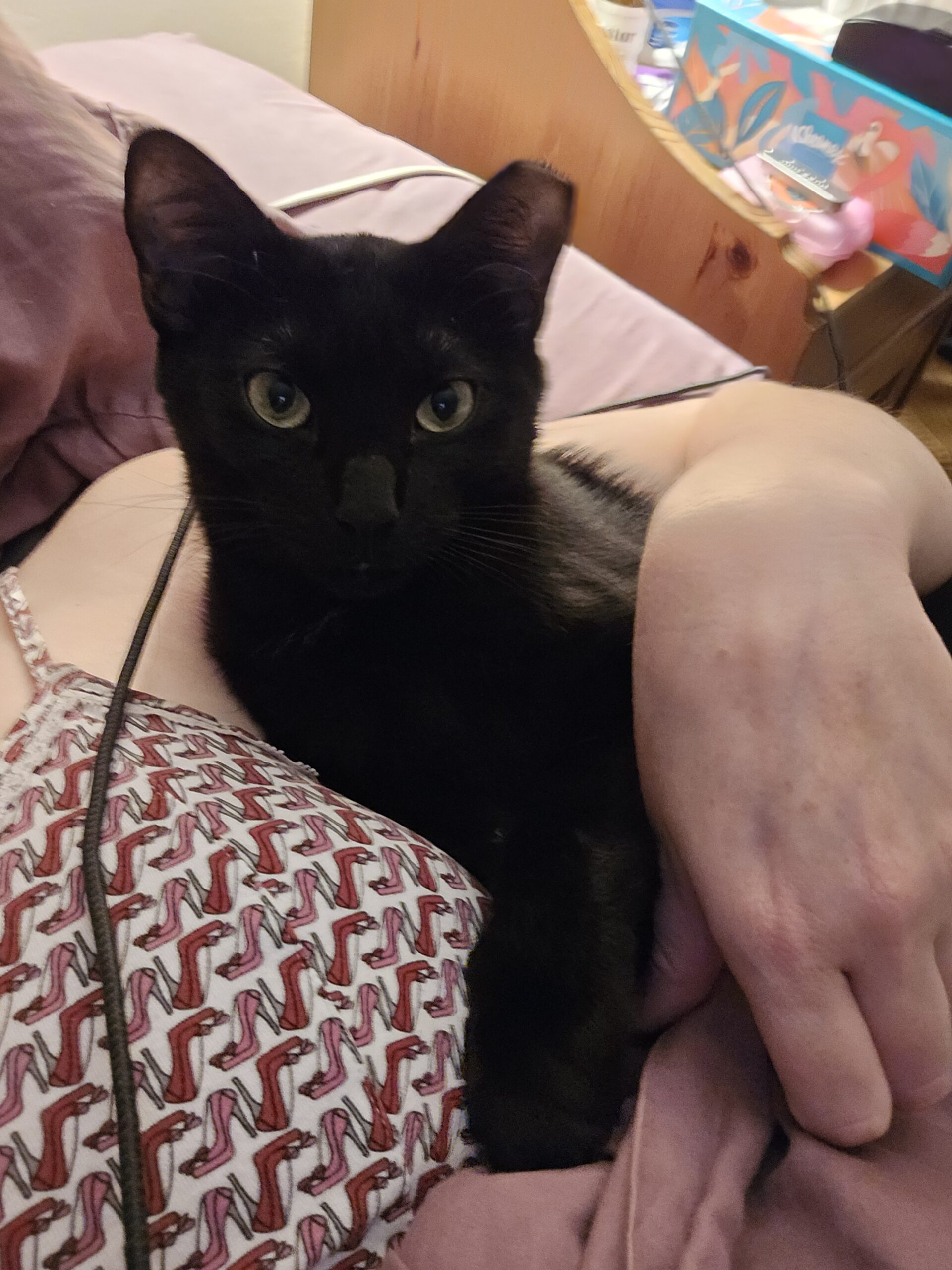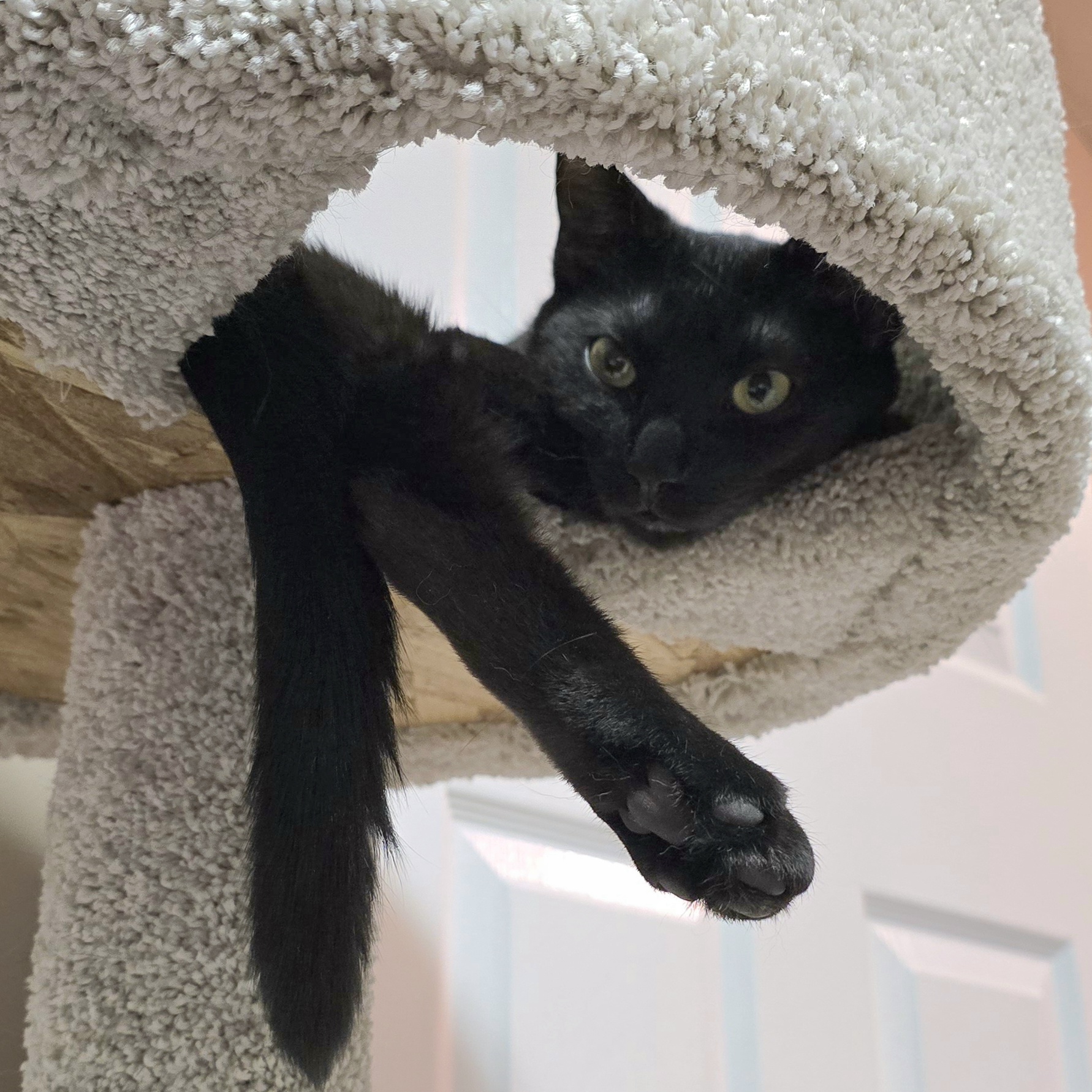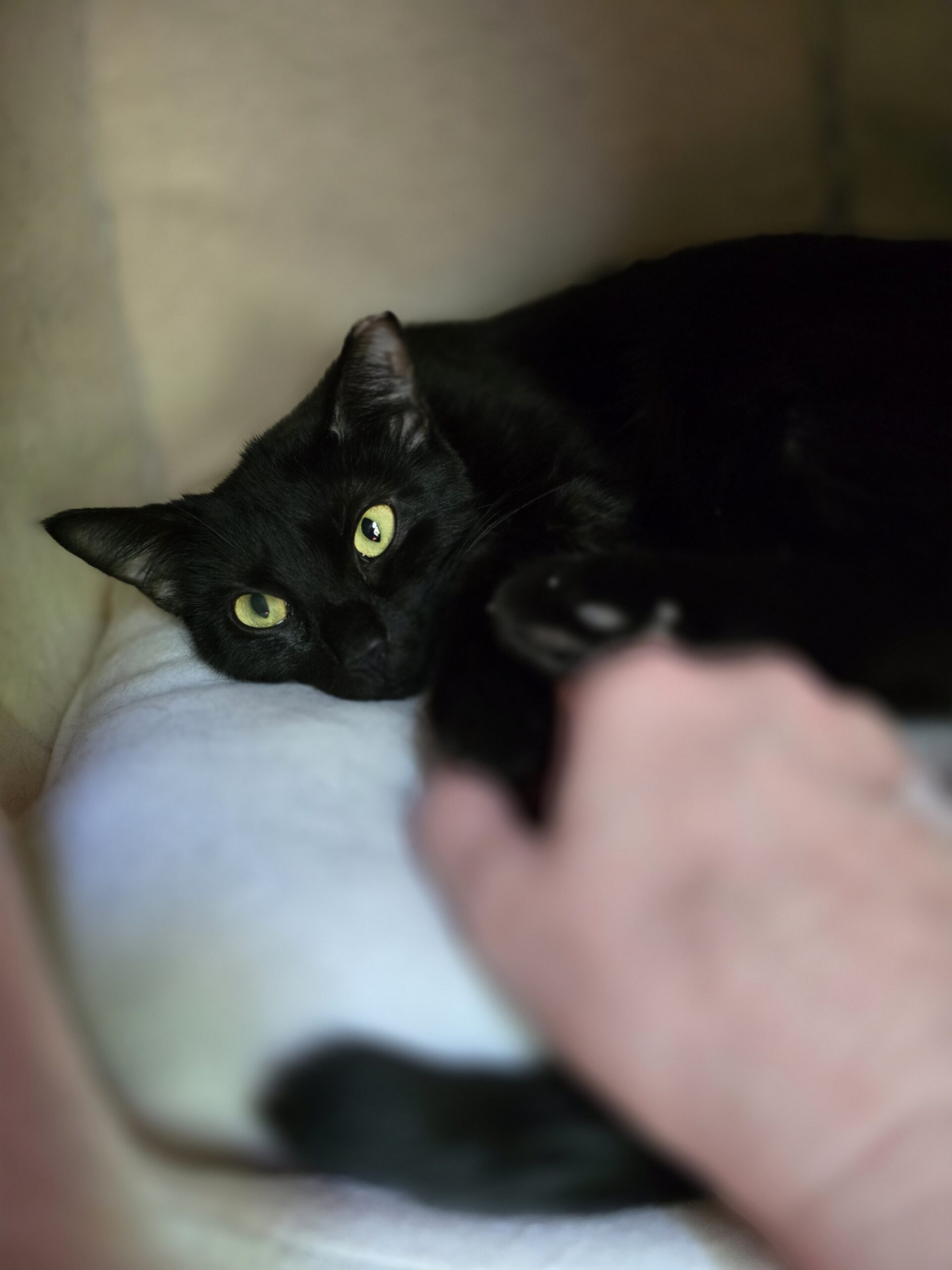 Despite her progress, Maddie will need a calm, quiet home with no small children, as she tends to bite when overstimulated. She still startles easily, but now she enjoys chasing her toys and galloping around the house like a tiny horse when she's feeling playful! She loves attention and head scratches and will follow you around from room to room. She has very silky fur.