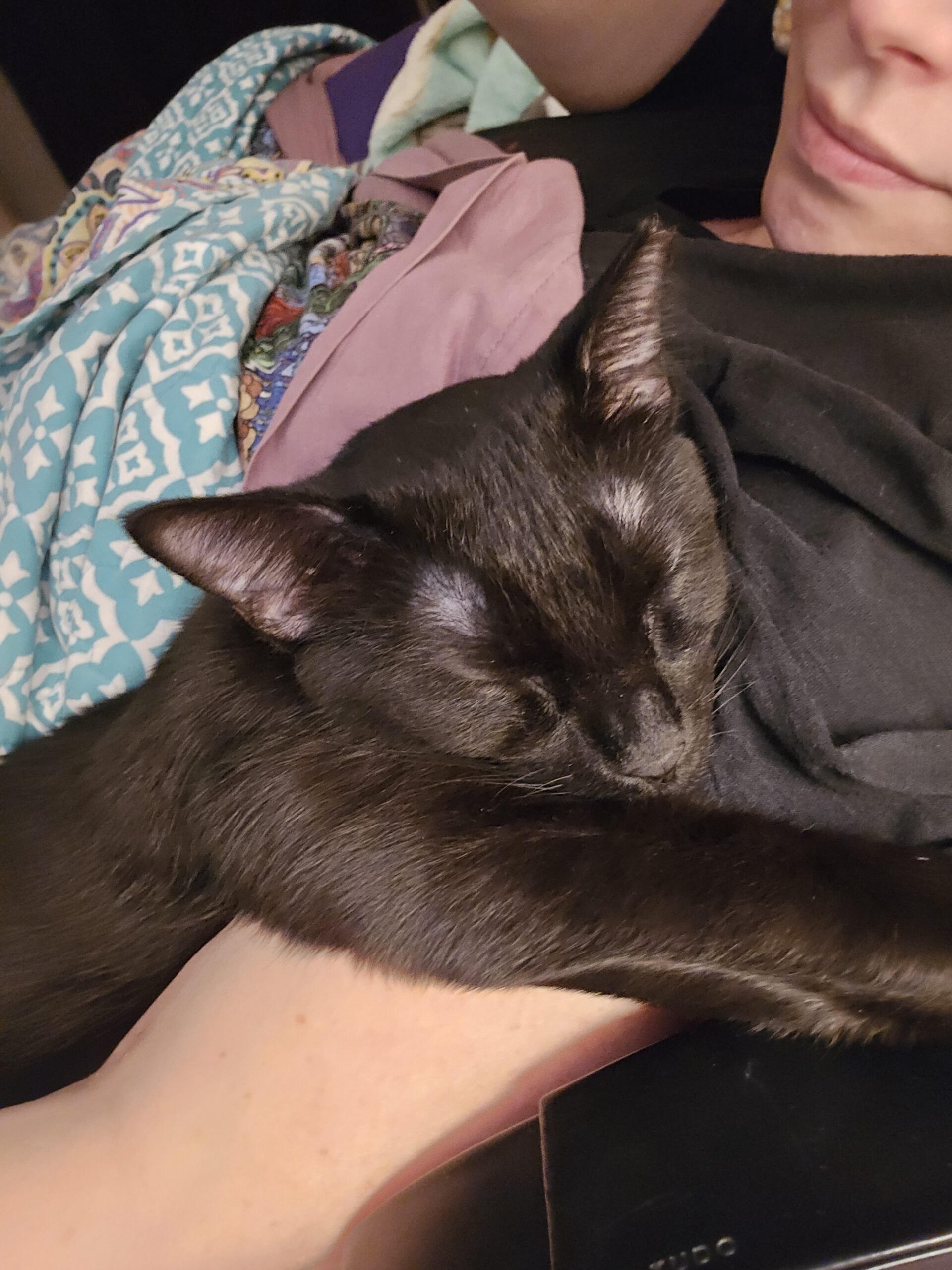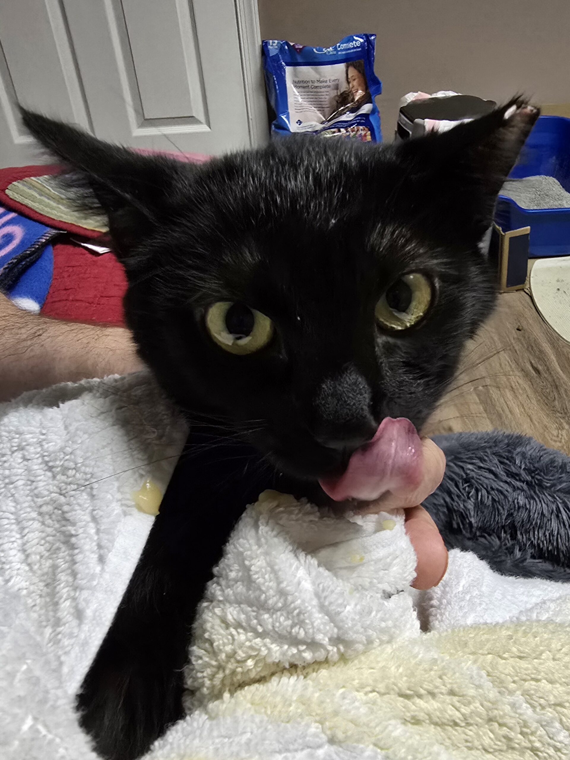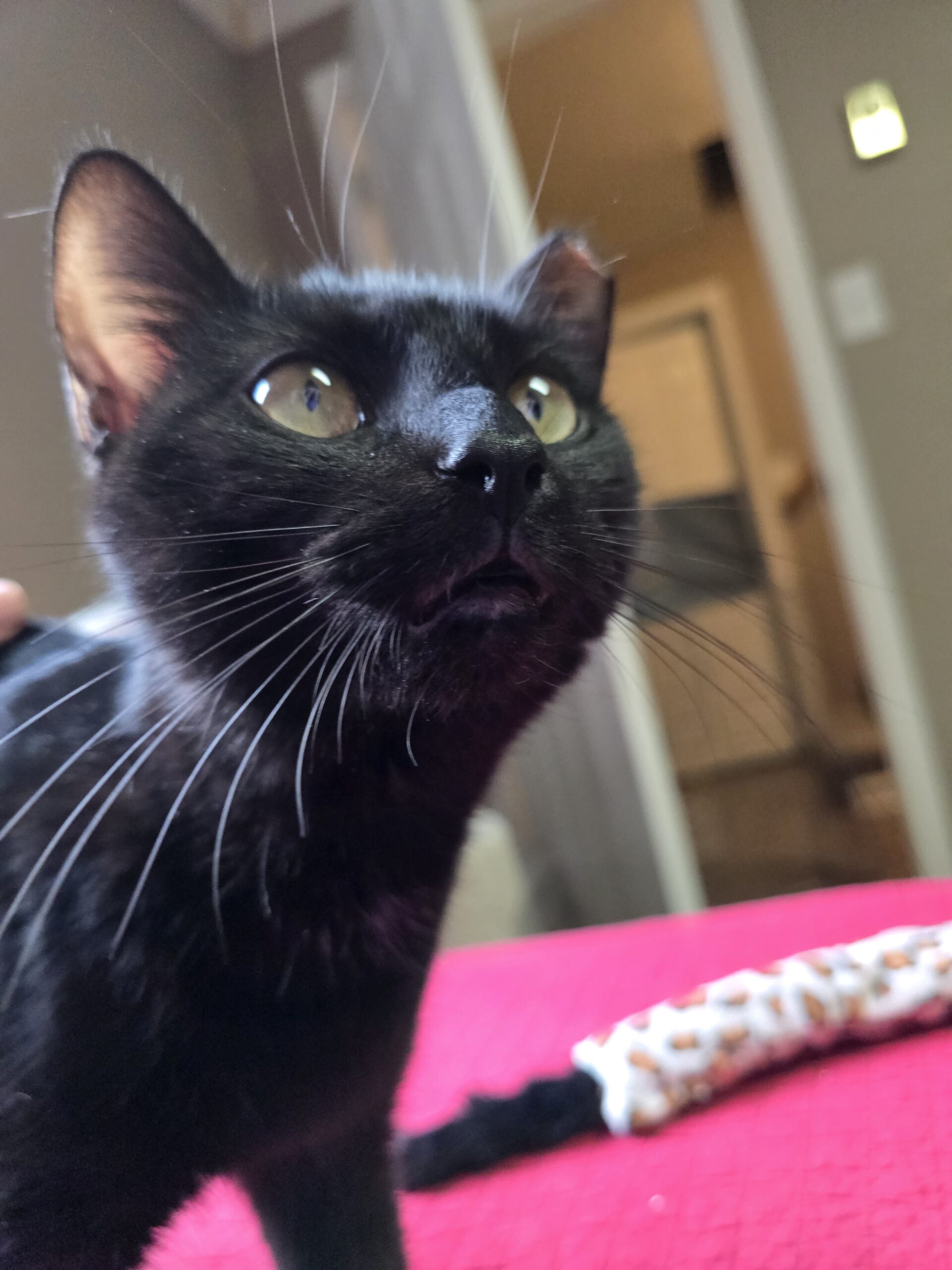 Despite her progress, Maddie will need a calm, quiet home with no small children, as she tends to bite when overstimulated. She still startles easily, but now she enjoys chasing her toys and galloping around the house like a tiny horse when she's feeling playful! She loves attention and head scratches and will follow you around from room to room. She has very silky fur.