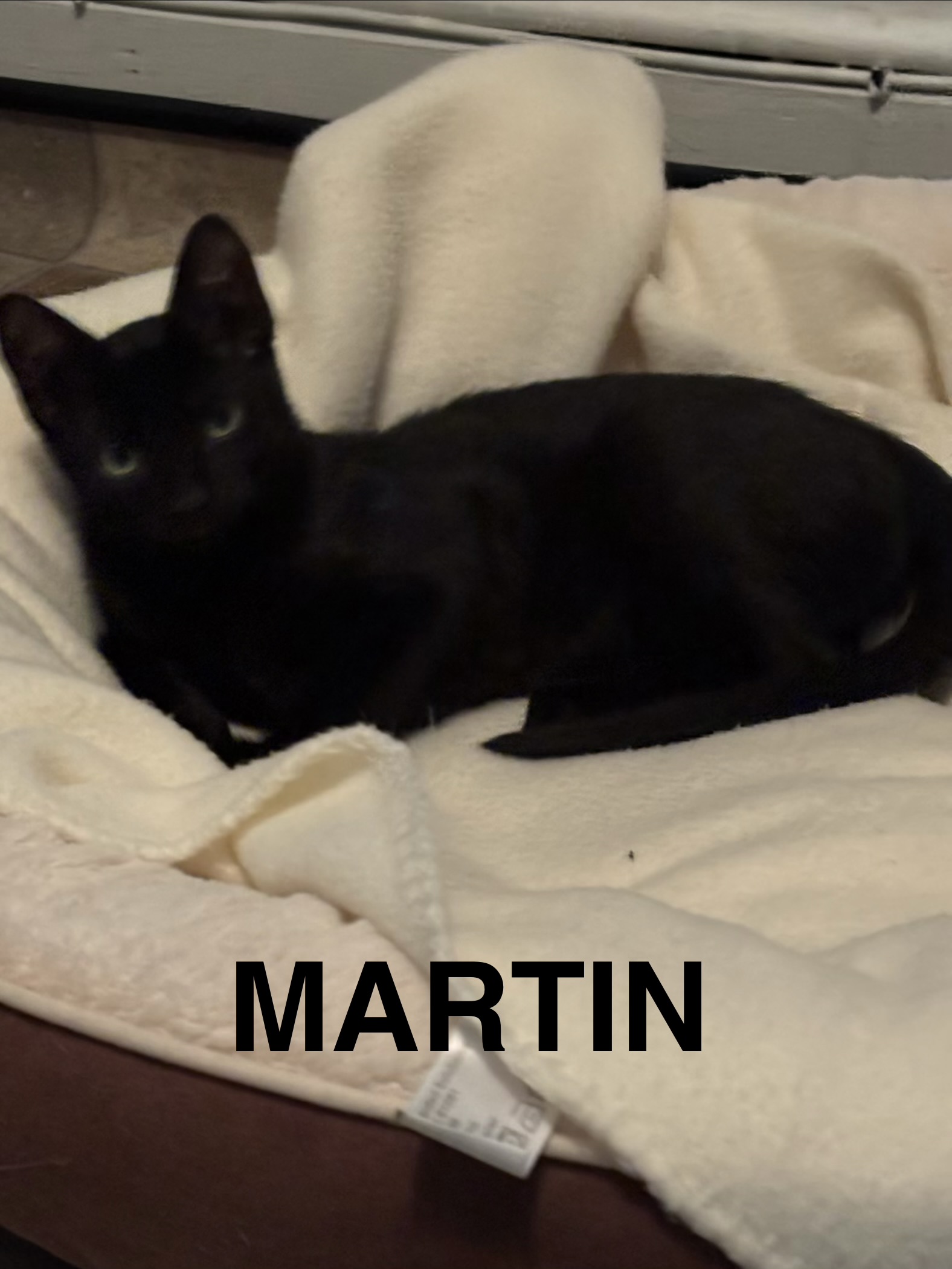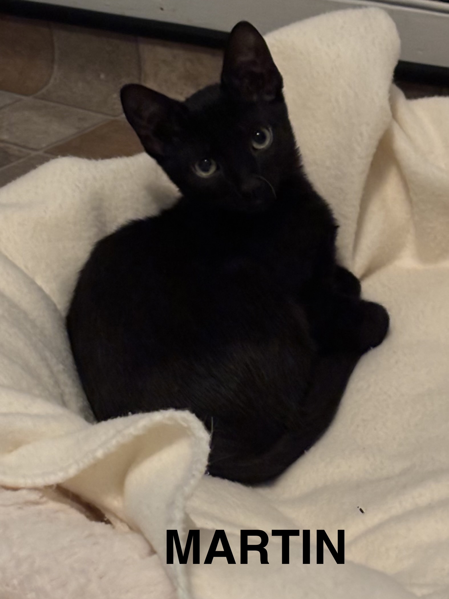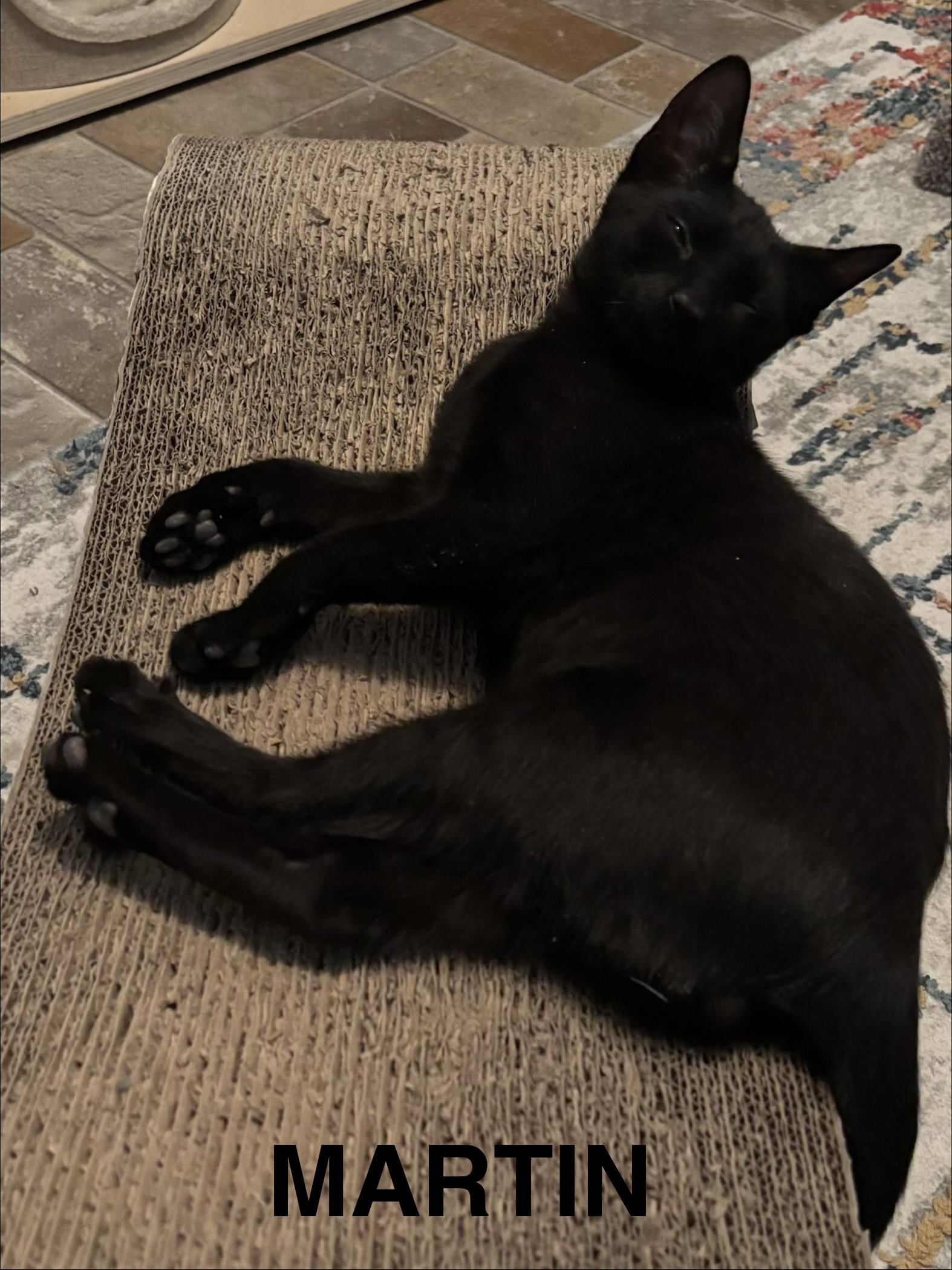 Meet Martin, a neutered, all black male, sweet with a playful spirit. He is the comic, to Rowan’s straight man. The bonded Brothers together create such hijinks you just have to laugh. Whether it is chasing balls and Springs or playing tag up and down the trees throughout the room. Both boys love lap time and a good treat, rarely do you see one without the other. They support similar body structures,, being long and lanky with very long tails and chiseled facial features, yet have distinct personalities. Martin will be the first to greet you and want to be on your lap. Rowan will follow wanting to know what all the purring is about. they are calm enough to run the vacuum Shark while they stay and watch. Both will tolerate a barky dog.If you enjoy a good stand-up comic duo, don’t miss this pair. You won’t be disappointed