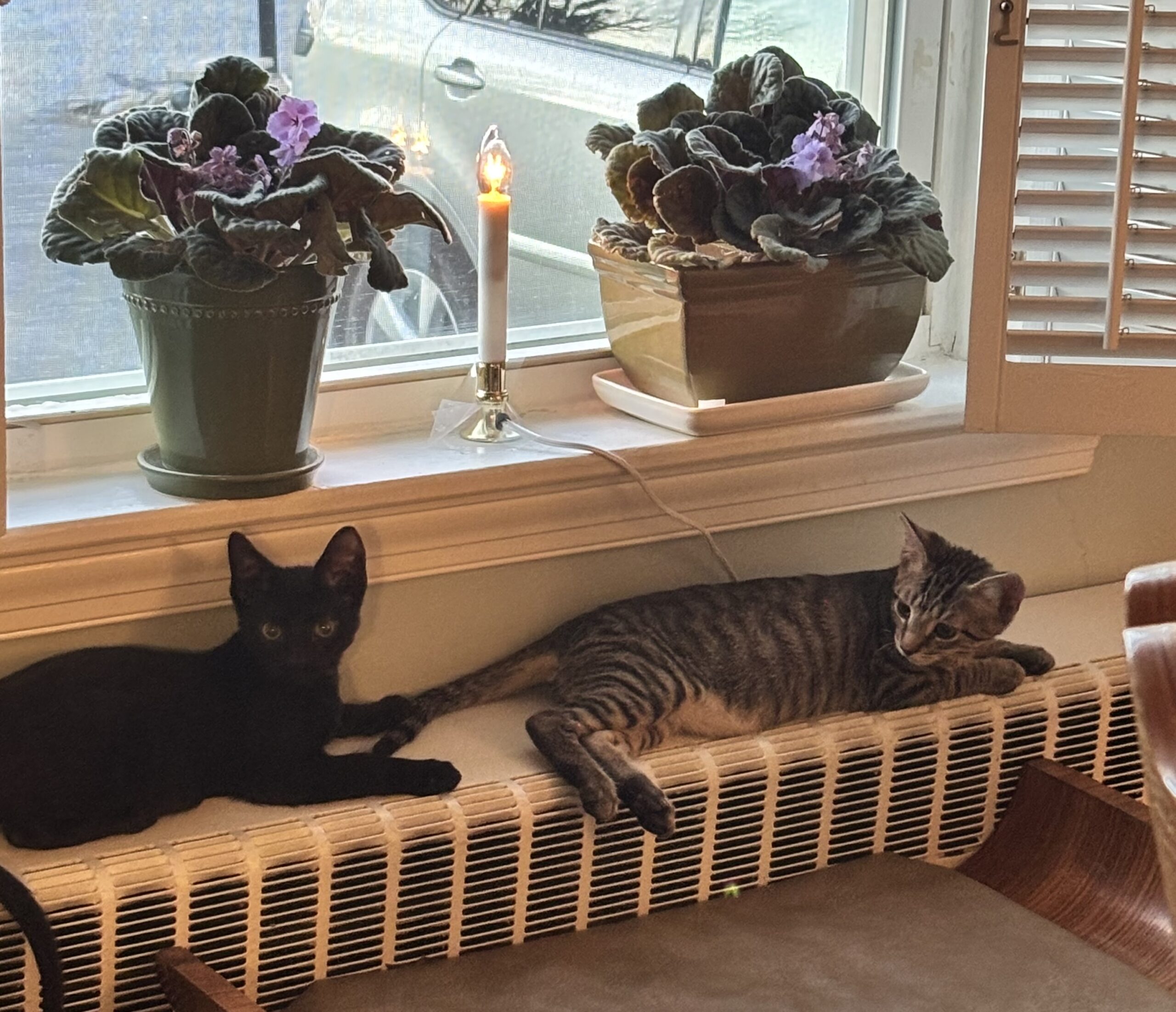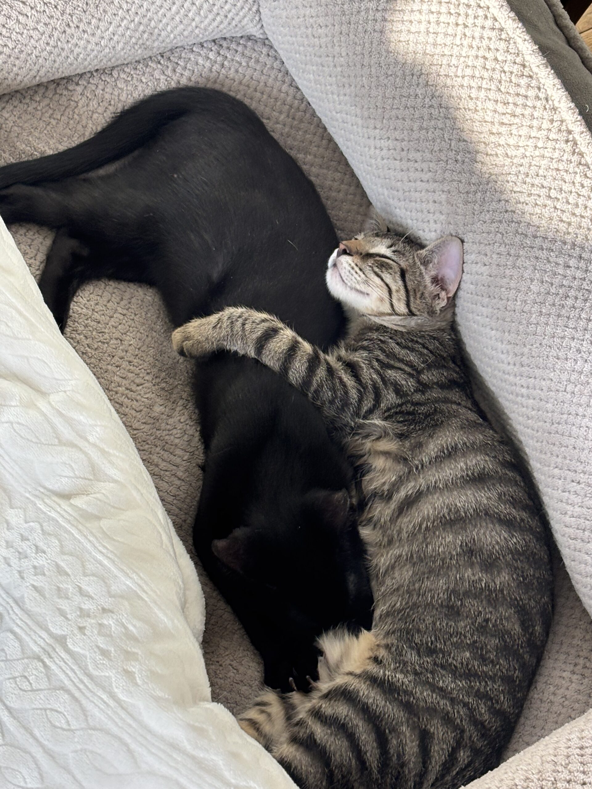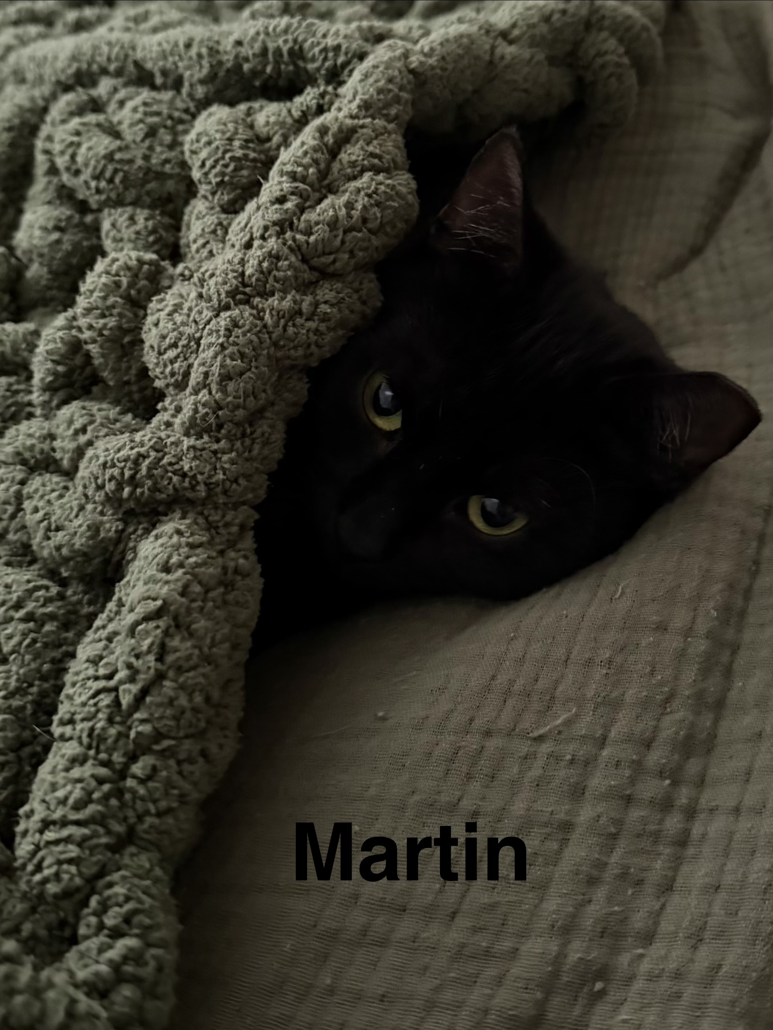 Meet Martin, a neutered, all black male, sweet with a playful spirit. He is the comic, to Rowan’s straight man. The bonded Brothers together create such hijinks you just have to laugh. Whether it is chasing balls and Springs or playing tag up and down the trees throughout the room. Both boys love lap time and a good treat, rarely do you see one without the other. They support similar body structures,, being long and lanky with very long tails and chiseled facial features, yet have distinct personalities. Martin will be the first to greet you and want to be on your lap. Rowan will follow wanting to know what all the purring is about. they are calm enough to run the vacuum Shark while they stay and watch. Both will tolerate a barky dog.If you enjoy a good stand-up comic duo, don’t miss this pair. You won’t be disappointed
