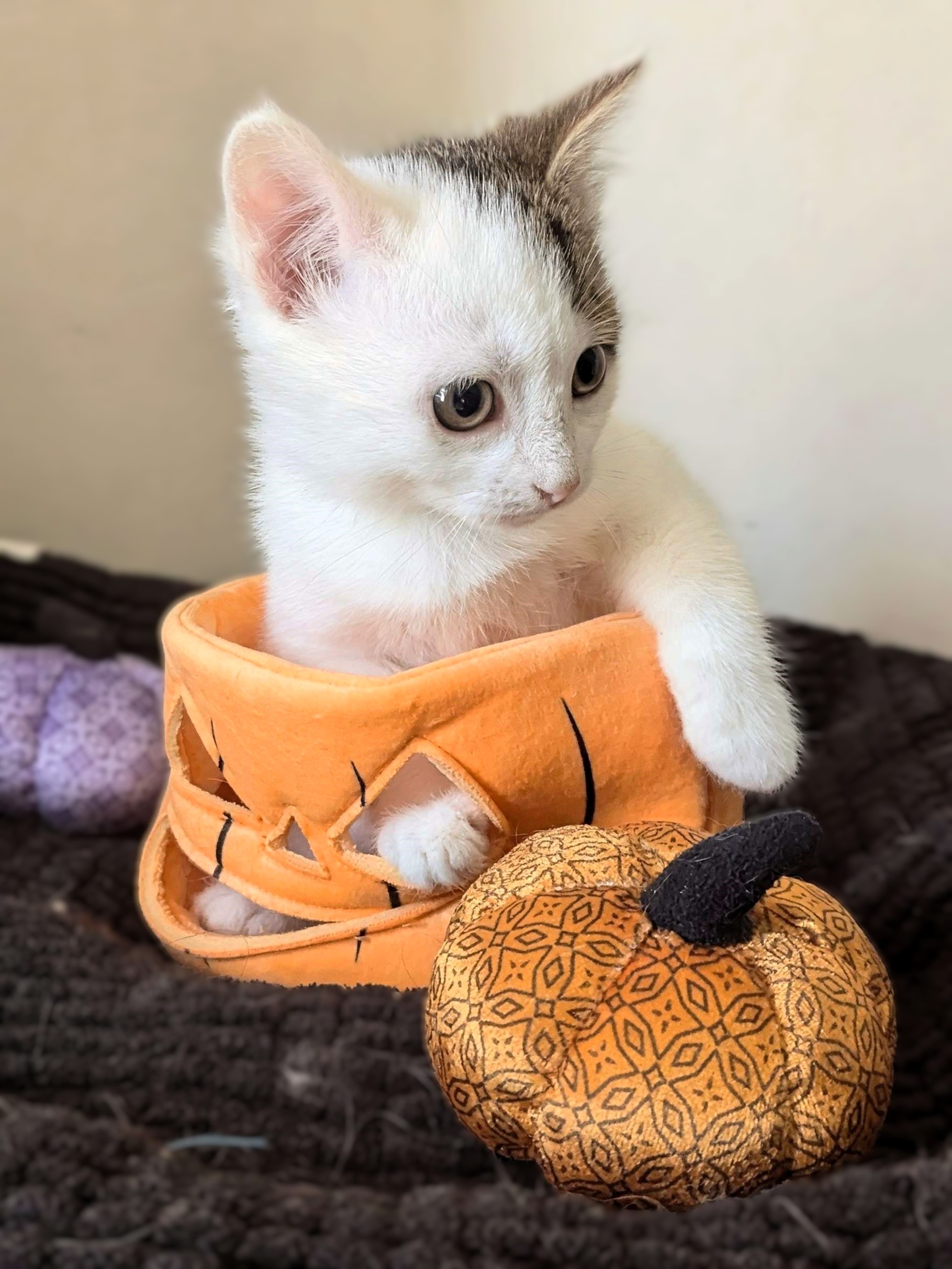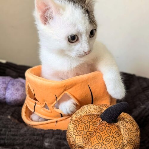 The shy one of the litter, Morrigan can often be found snoozing in a corner or curled up with one of her siblings. While she is still a little shy of being approached, she doesn't mind being held and will fall asleep while you hold her. She loves to play and battle with her siblings, and would love to find a home with one of them or another kitty friend.