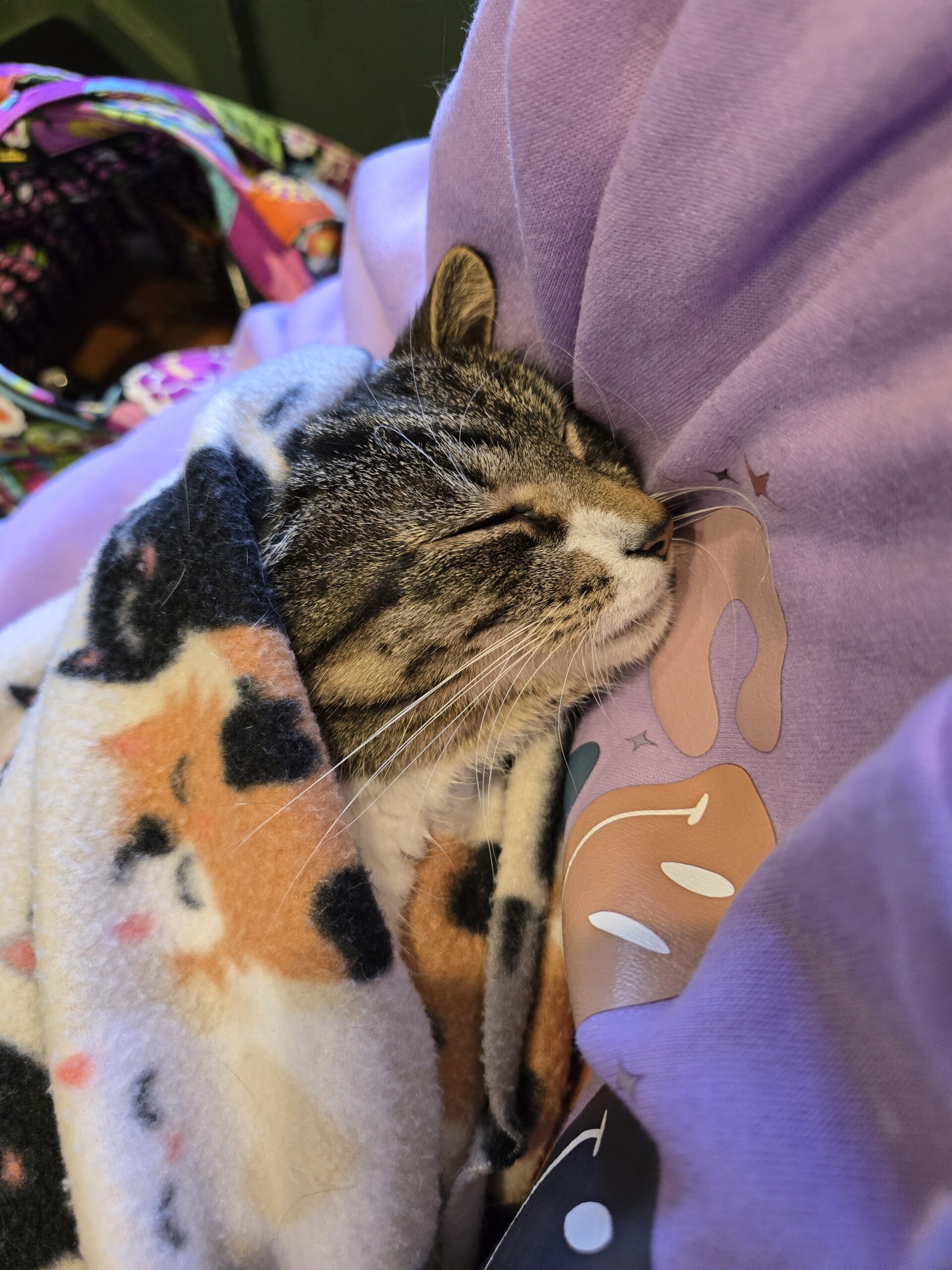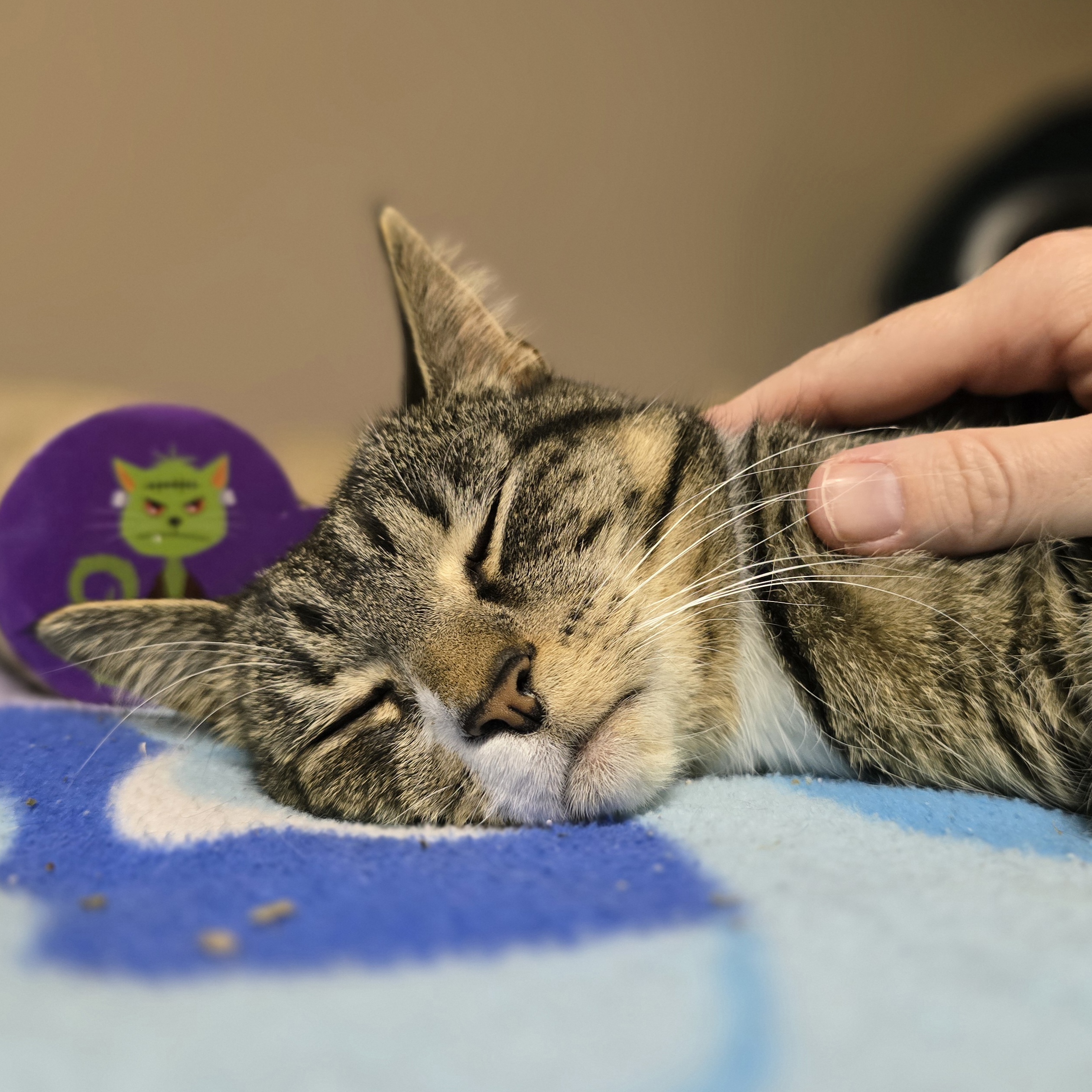 Nala came into our care terrified of everything and everyone, hiding curled up in a ball and growling at every movement around her. In her weeks in foster care, she has started to relax, greeting her foster with the cutest meows and starting to show her adorable personality. Once afraid to be touched, Nala now loves pets and kisses! She enjoys being held in a blanket like a baby, which is when she is the most relaxed.
