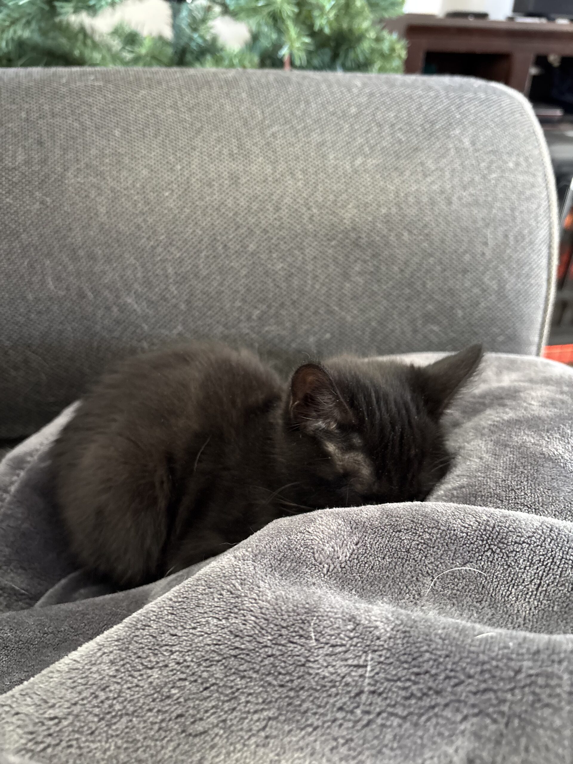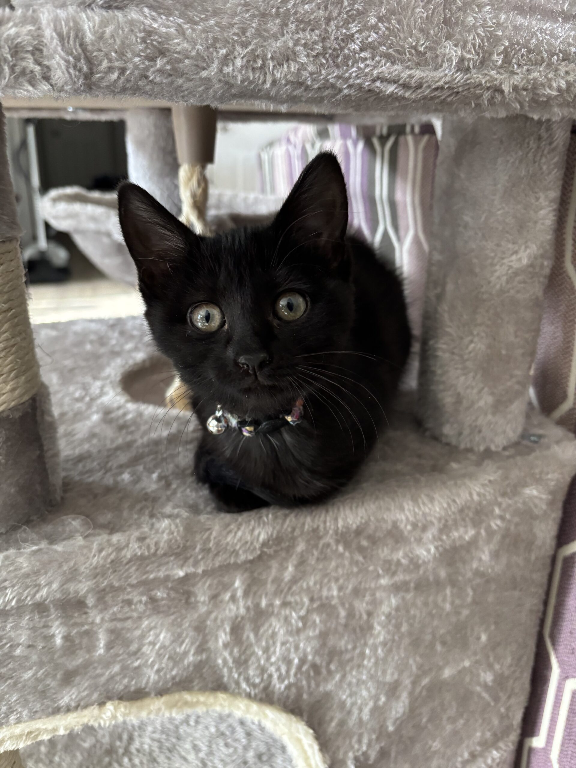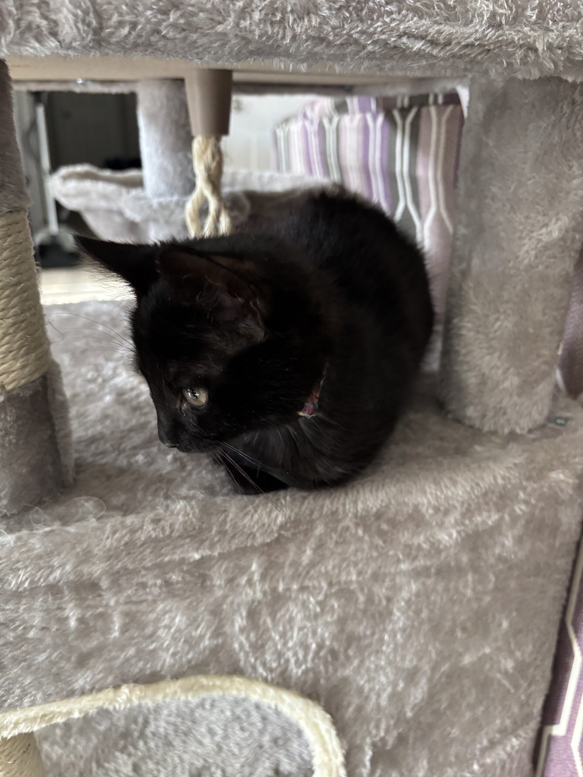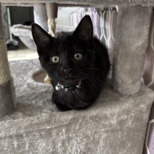 This sweet little girl is a big personality in a tiny kitten-sized body. She came to foster with her littermates, and was the tiniest of the bunch, but had a lot to say! She had a bit of a rough start, but big sister Marcy made sure she pulled through, and she has done just that! She loves to run, jump, and wrestle, and she is also very happy to snuggle with her foster family and her big dogs alongside her sister. If you are looking for a kitten that will keep you on your toes, Peep and Marcy will do that in spades.