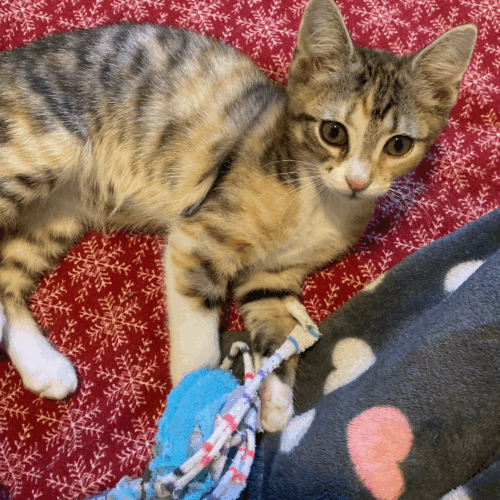 Playful and affectionate, petite Queenie is a whirlwind of kitten charm. Her beautiful markings and sweet disposition make for a wonderful addition to any family. She’s grown up in a foster home with her 3 brothers (King, Jack, and Ace), numerous cats and a cat-friendly dog and gets along well. She would do best in a home with other fur friends.