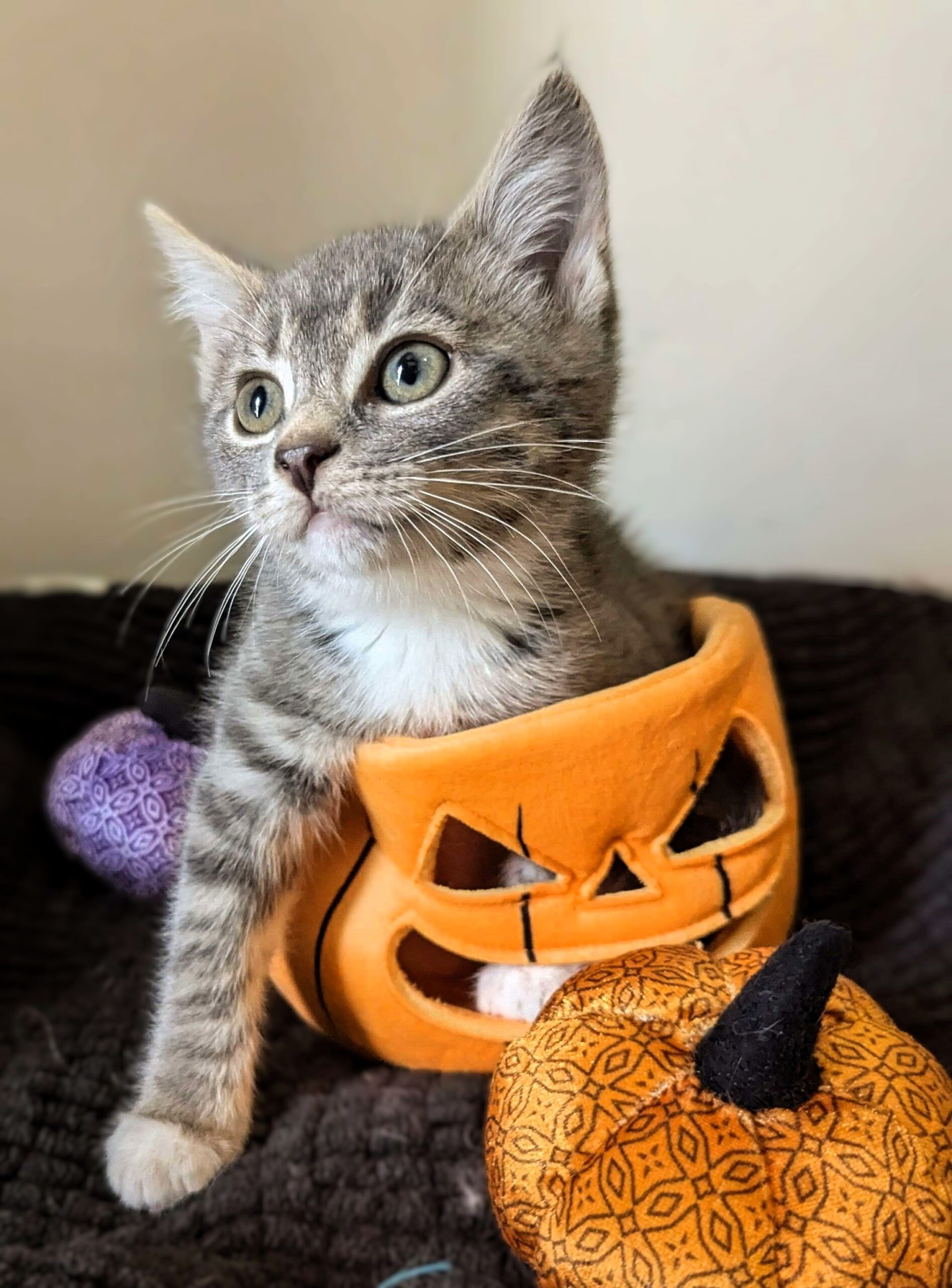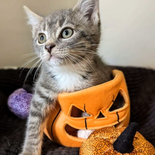 The intelligent one of the litter, Salem was the first one to figure out how to climb to the top of her enclosure, and also the first to figure out how to eat the churu from the tube! She enjoys scritches and playing, and can often be found napping upside down with her arms stretched out. She would love to be adopted with one of her siblings or to a home with another kitty friend.
