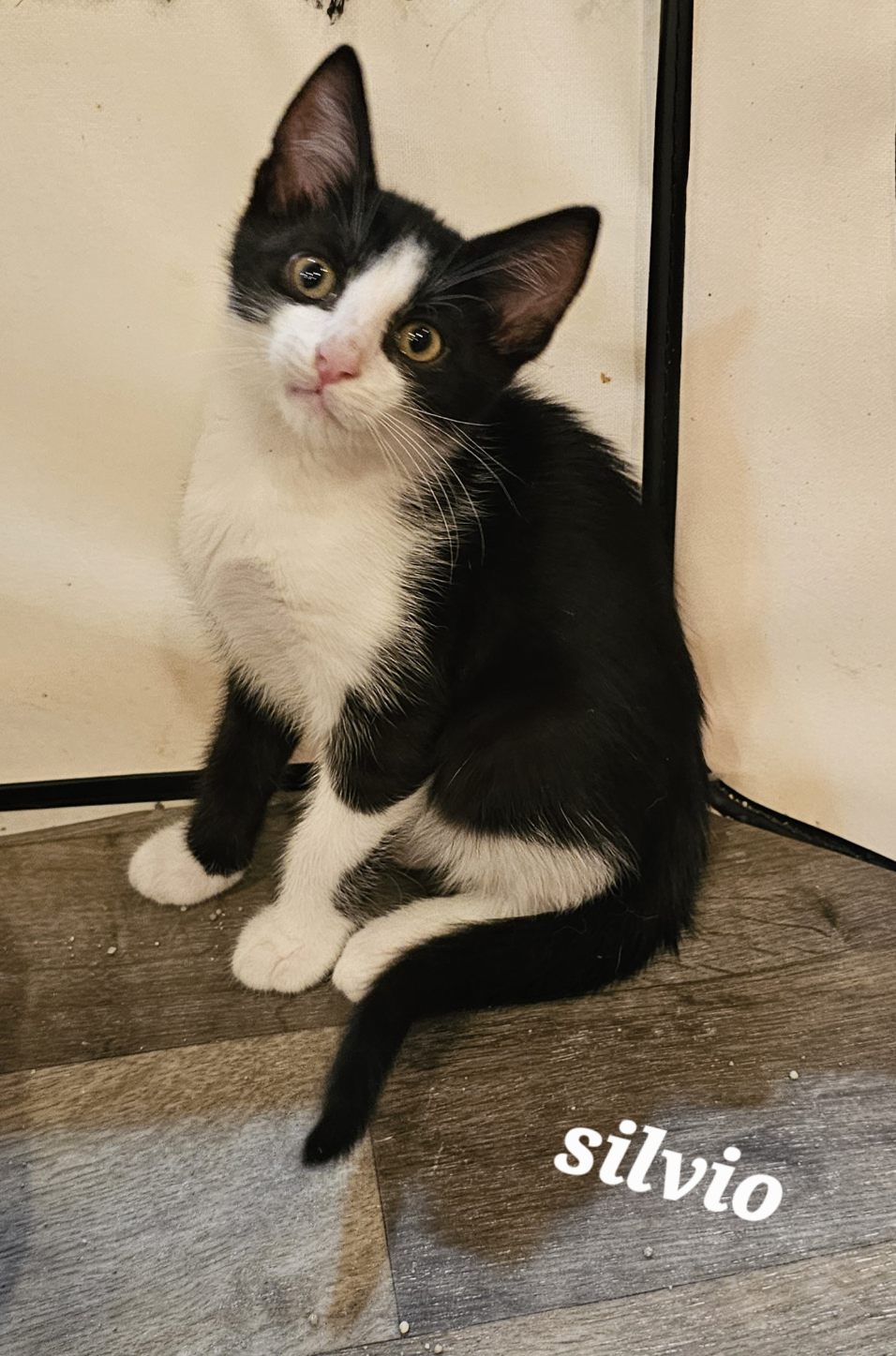 Hi, I’m Silvio! I’m one of the Abbottstown litter. I’m a handsome tux boy, just about to turn 10 weeks old! I’m a super sweet gentleman who turns into a little purr machine when you give me snuggles. I love play time and snack time, and am ready for my forever family. I love other kitties, and get along good with foster mom’s dog. I’m also ok with kitty experienced kids who are gentle with me. I’m up to date on my vaccinations, FIV/Felv negative, and my adoption will come with a voucher to have me neutered at no cost.