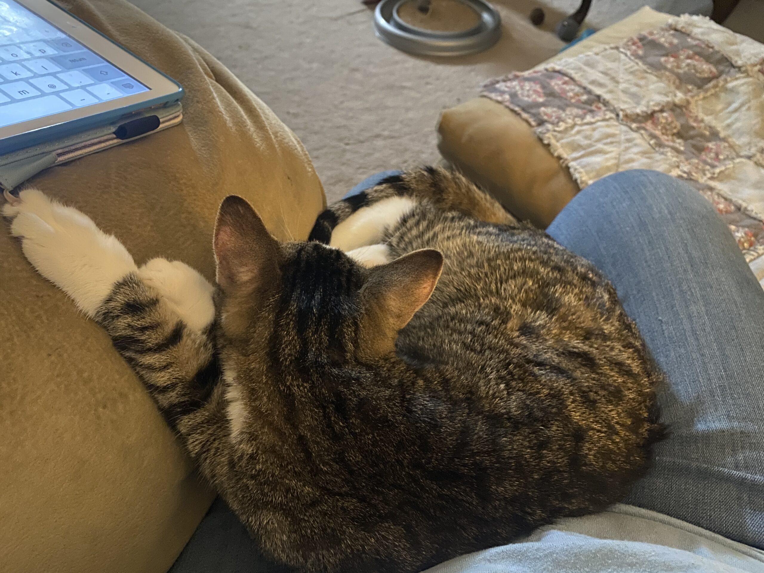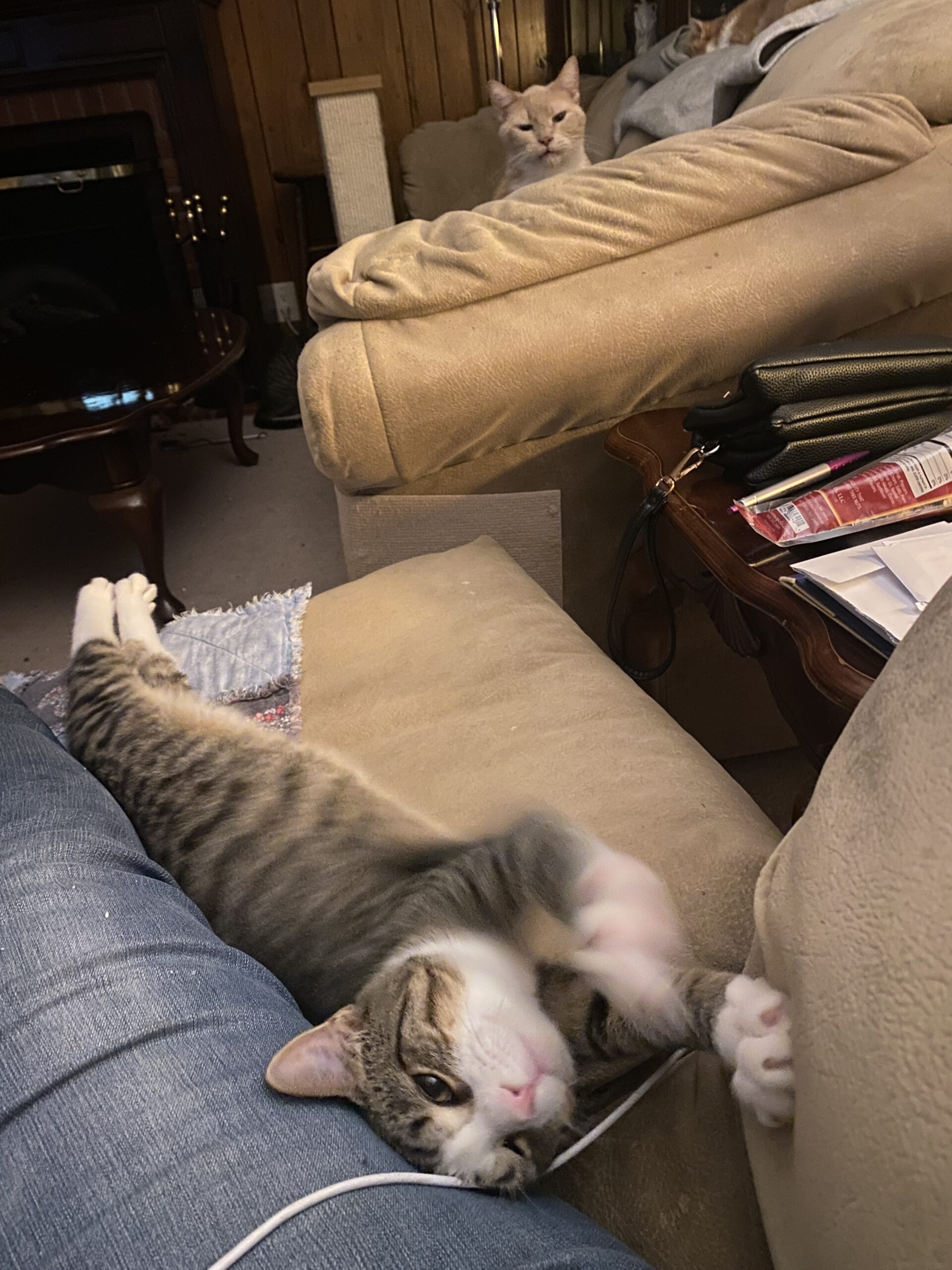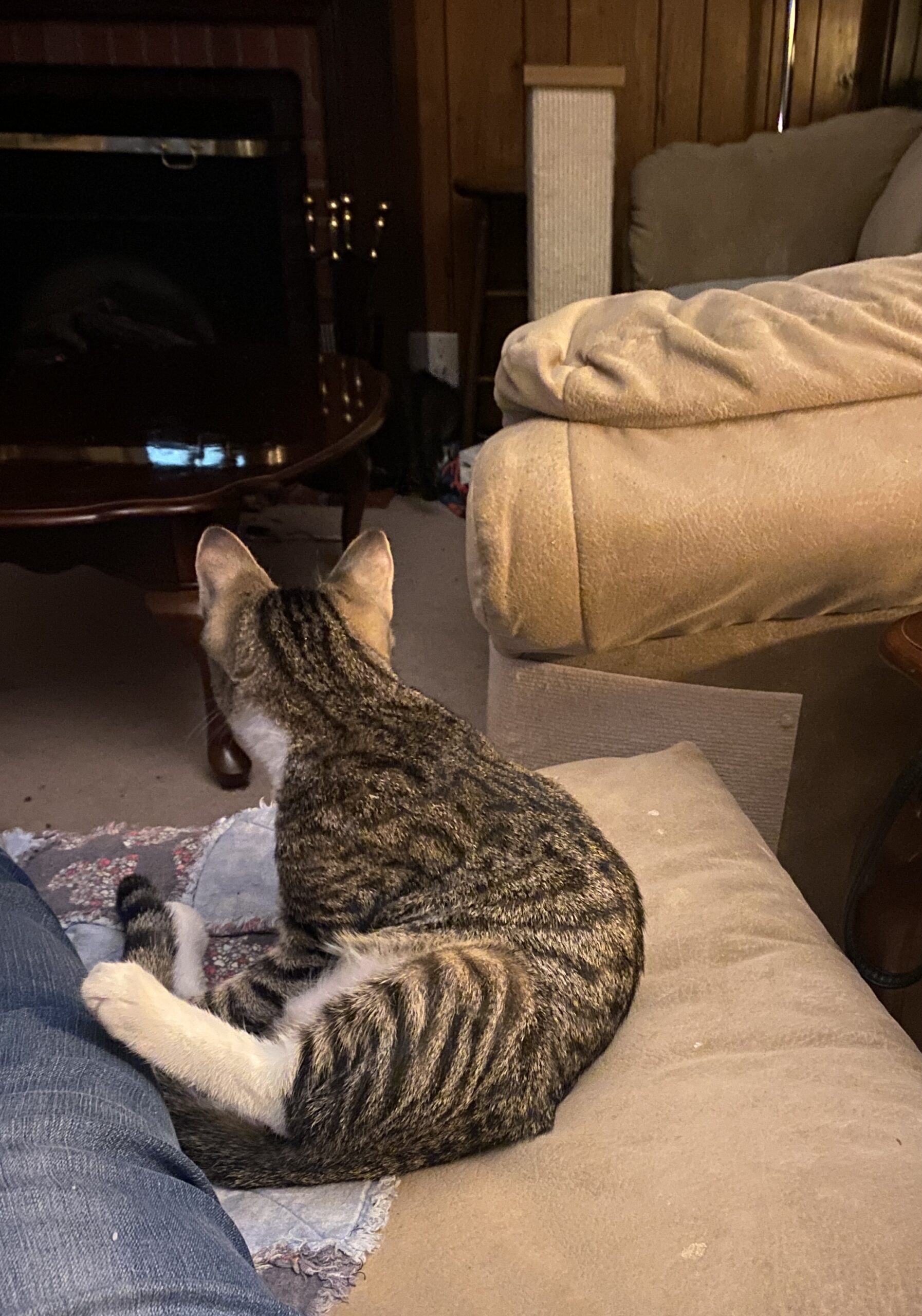 After a good play session, Sparky’s favorite place to be is right on your lap, where he can relax and cuddle. He does great with other cats and even grew up around a large Blue Heeler dog until he was about 10 weeks old, so he’s well-socialized and adaptable.