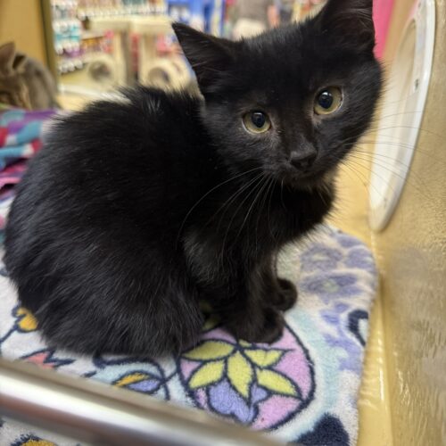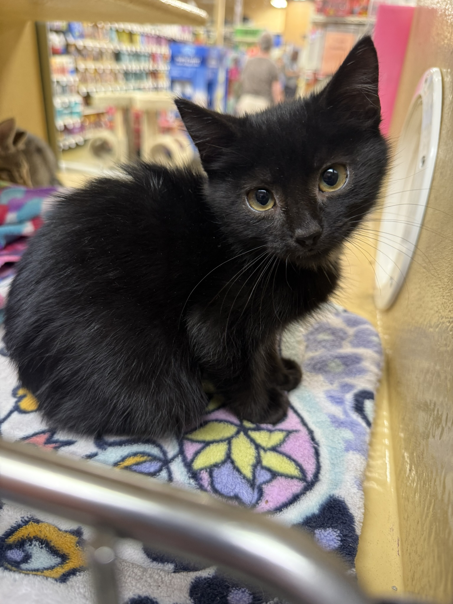 This sleek little shadow is Sterling, a 10-week-old all-black kitten with a heart as soft as his fur. He’s sweet, gentle, and still learning that the world is a safe and loving place. A little shy at first, Sterling blossoms with quiet affection and patient companionship—he’s the kind of kitten who’ll curl up beside you once he knows he’s home.