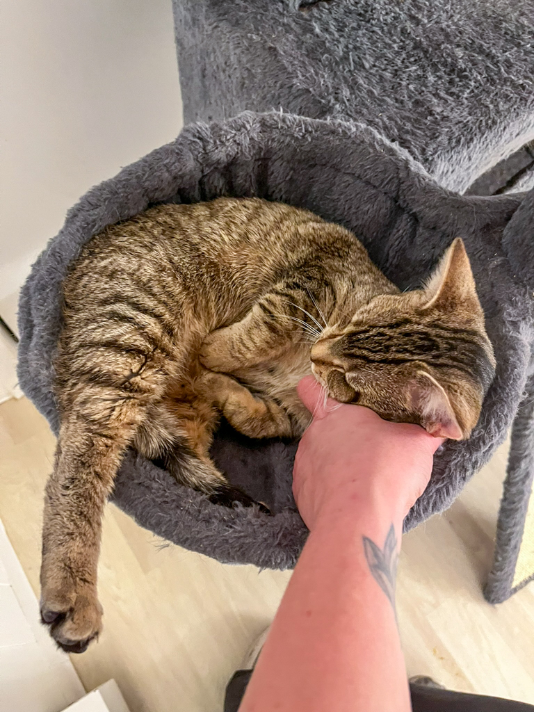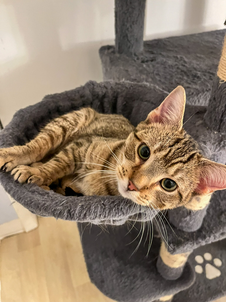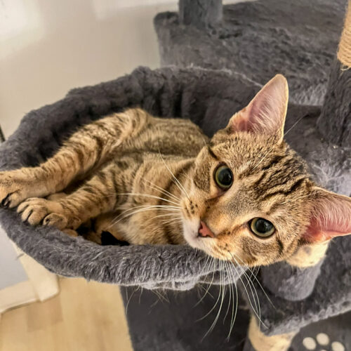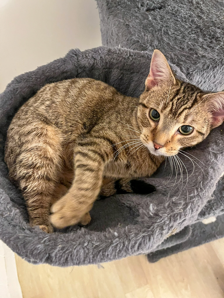 Tiger can be a bit timid at first, but once she feels safe, her gentle and affectionate nature comes shining through. She loves quiet company, soft pets and cozy spots where she can observe the world at her own pace. With a patient, loving family, she’s sure to blossom into a confident and cuddly companion.