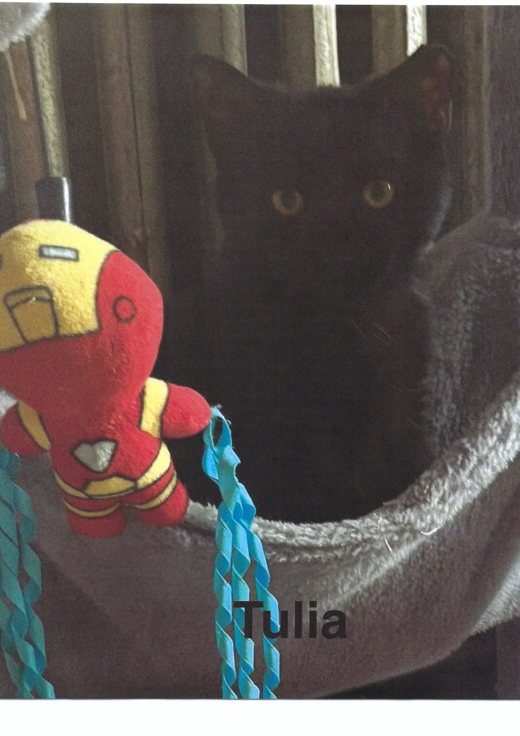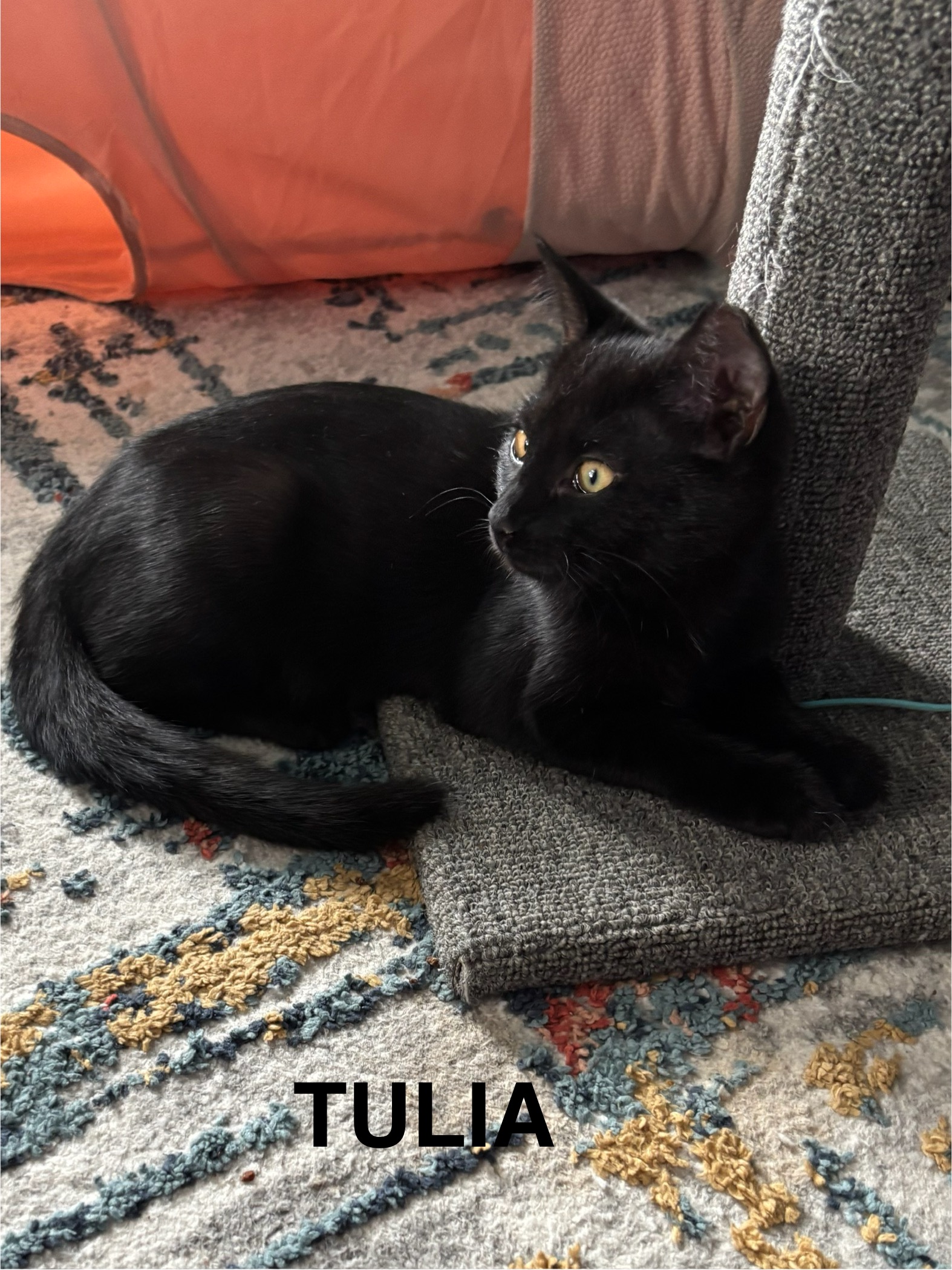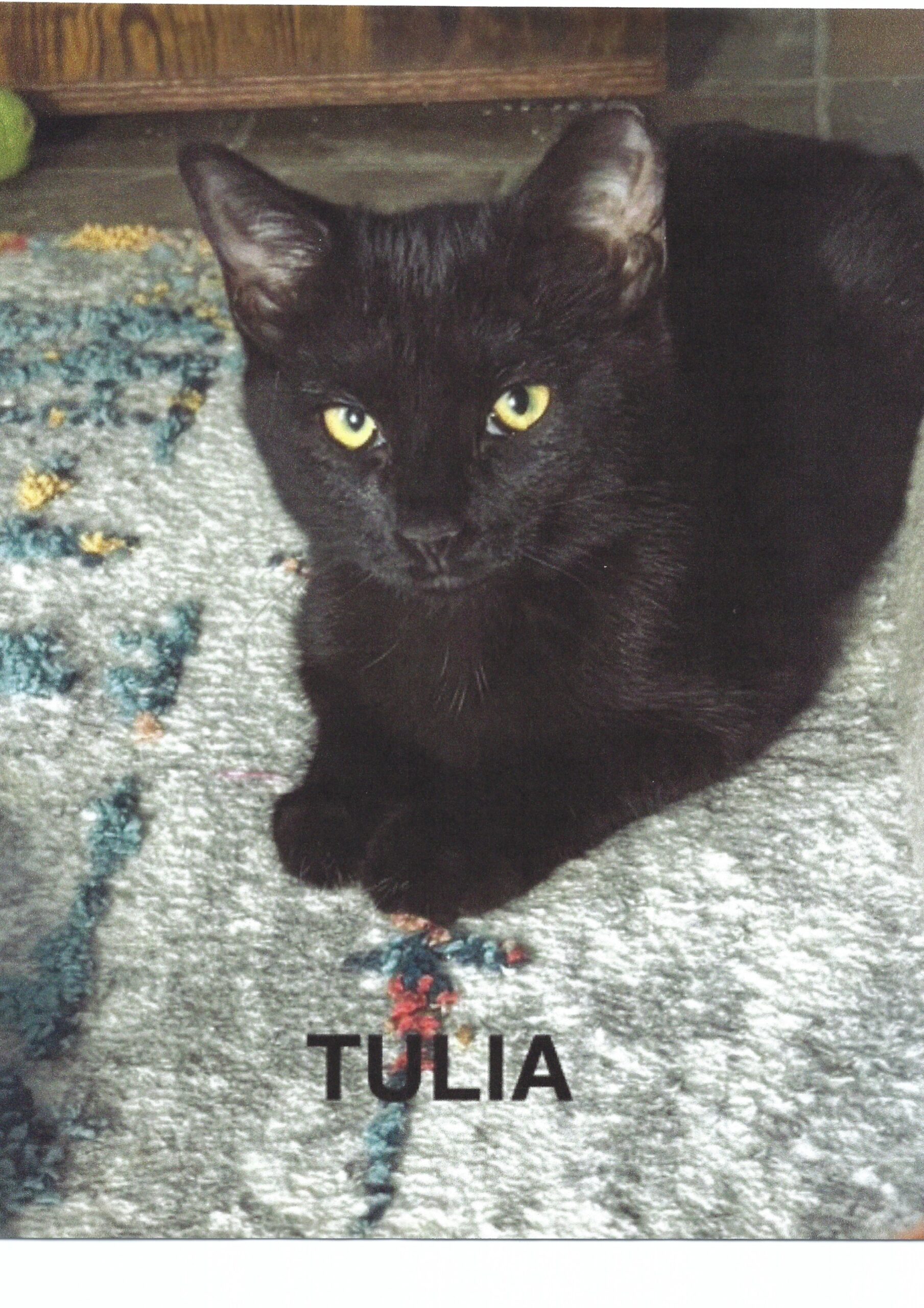 Tulia has come a long way in the 2 months she and her siblings have been in foster care, proving how docile a disposition she truly has. She loves to play with string and wand toys and anything that spins or moves. She is also a snuggler climbing onto your lap for pets in exchange for purrs. She can be picked up. Tulia, with her shiny, satiny like coat and long tail is quite the looker. If you are interested in a lovely pair, check out her brother, Cicero, a beautiful chocolate brown swirl tabby.