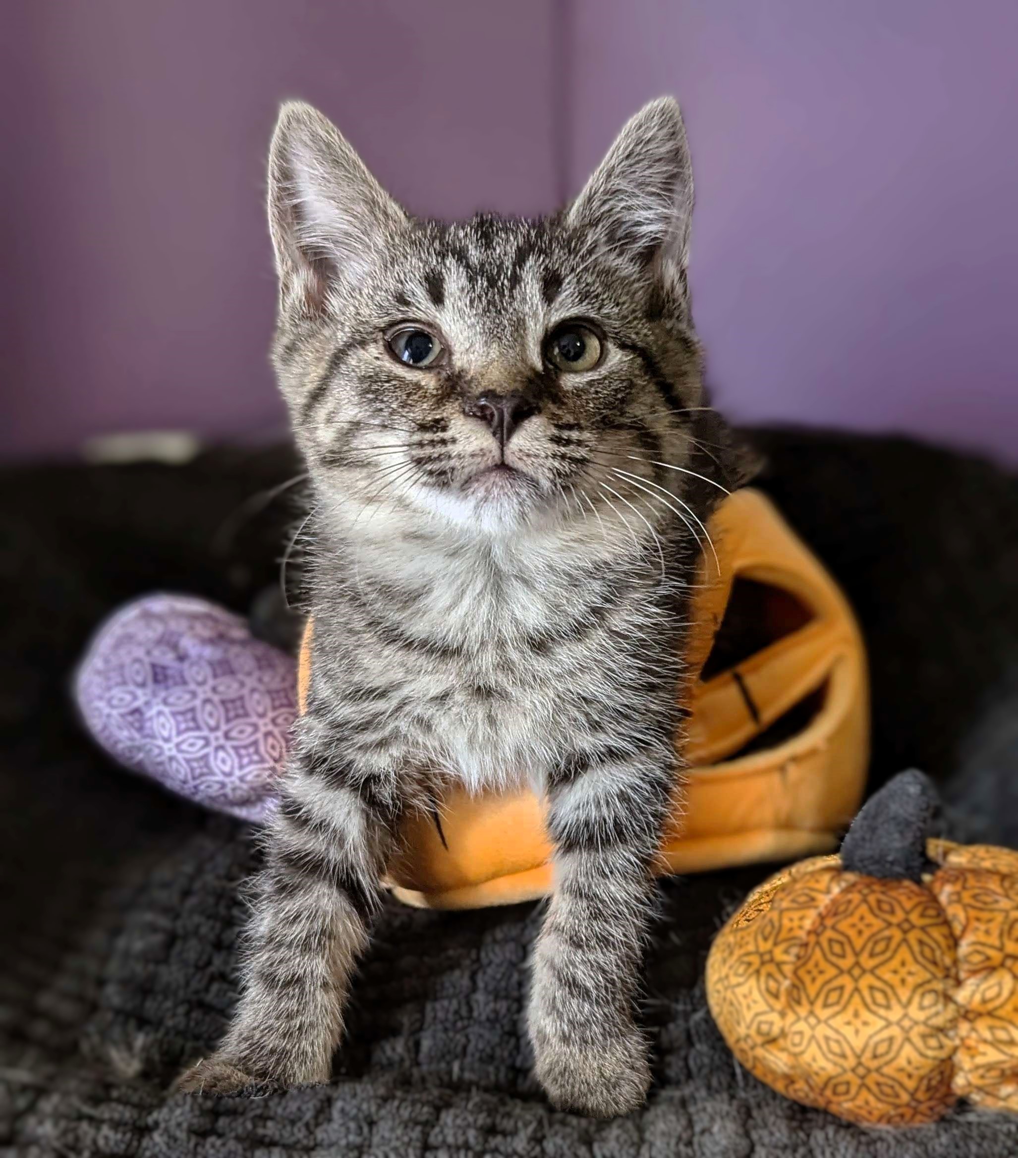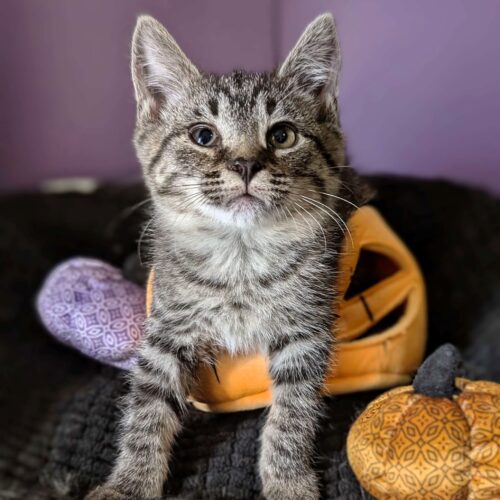 This little sweetiepie loves to wrestle and bat at toy wands. She doesn't mind being held and will be your best friend for the price of a churu. She would love to be adopted with one of her siblings or to a home with another kitty friend.